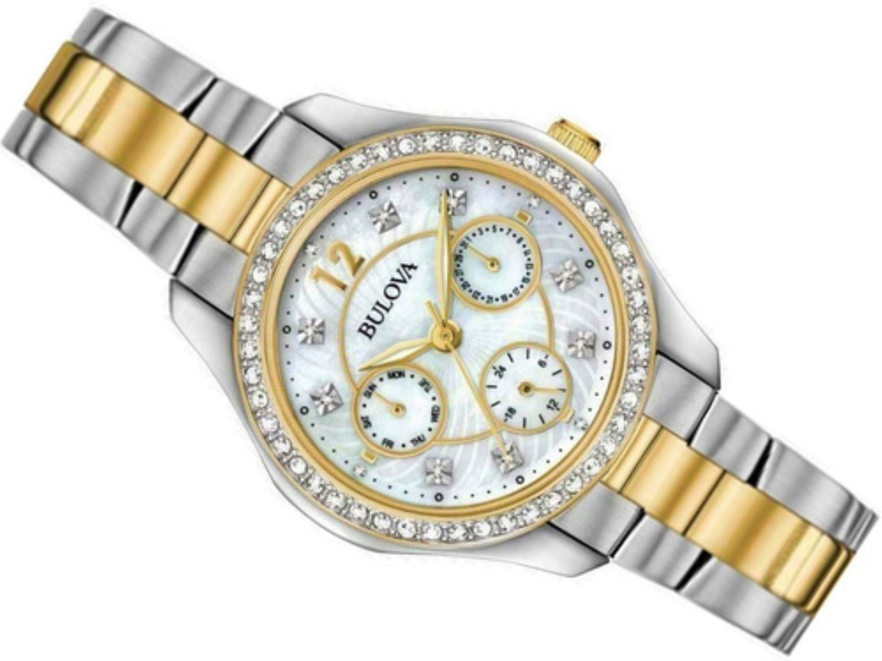Case Material: Stainless Steel - Case Diameter: 36mm - Case Crystal: Mineral Crystal - Water Resistance: 30 m (100 feet) - Dial Color: Mother-of-Pearl - Band: Silver and Rose Gold Stainless Steel Bracelet - Movement: Quartz - Made in China - (98N114)