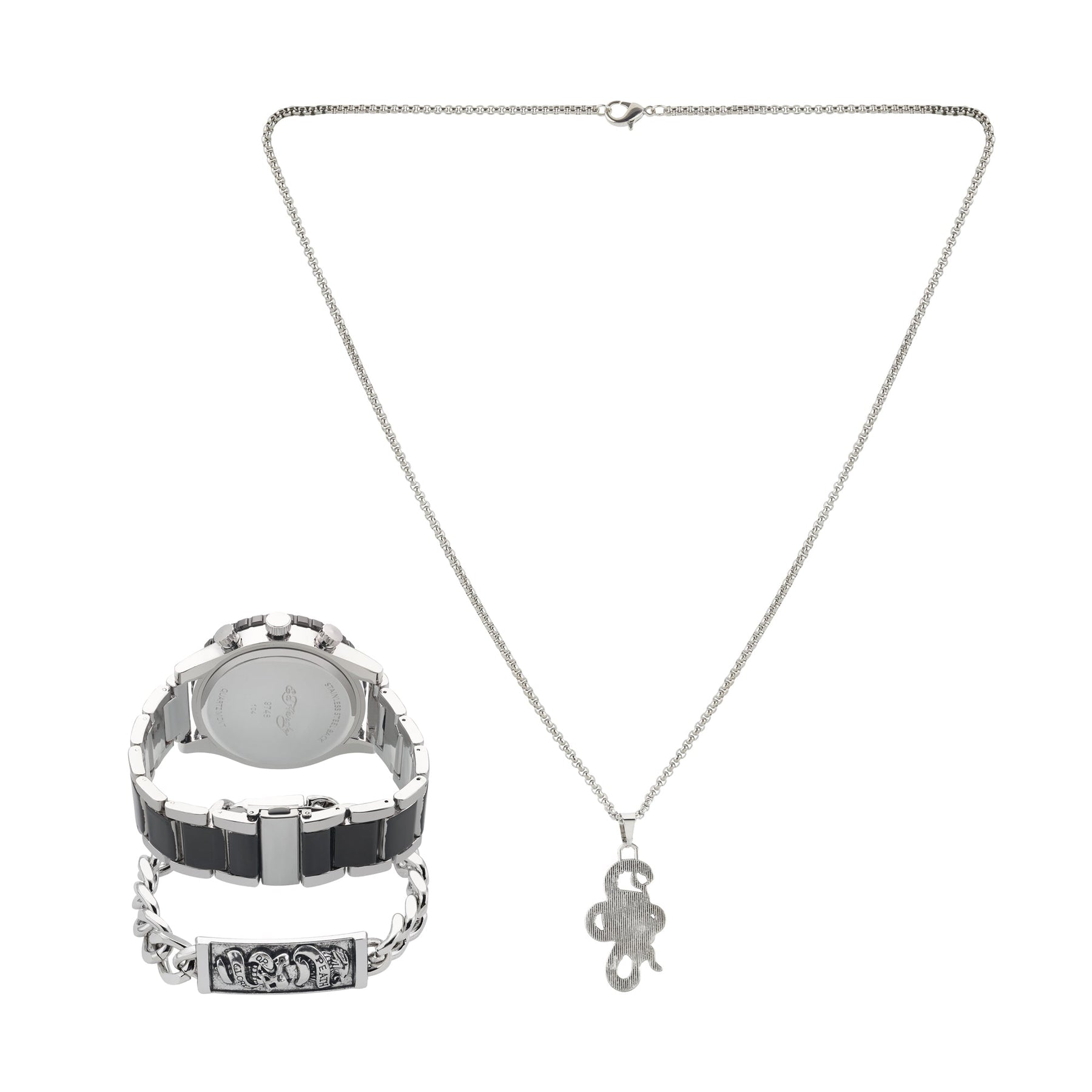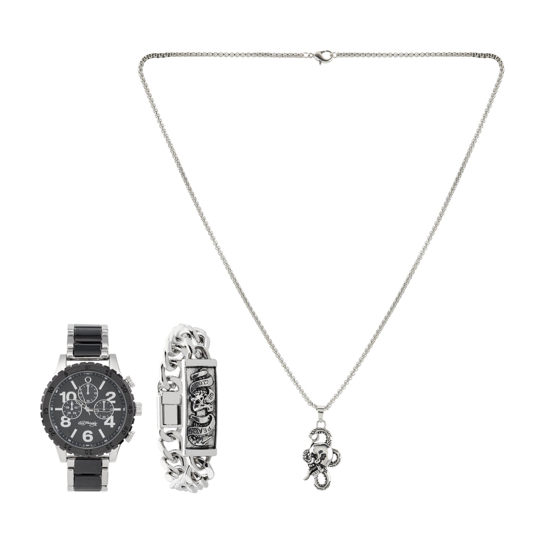 Classic looks, classic materials, yet unmistakably Ed Hardy Designed by Ed Hardy, this brushed silver and gunmetal watch features a gunmetal sunray dial adorned with an eye-catching skull pendant necklace and bracelet set. Offers a fashionable look based on intricate artwork. Style 9748S-42-D38