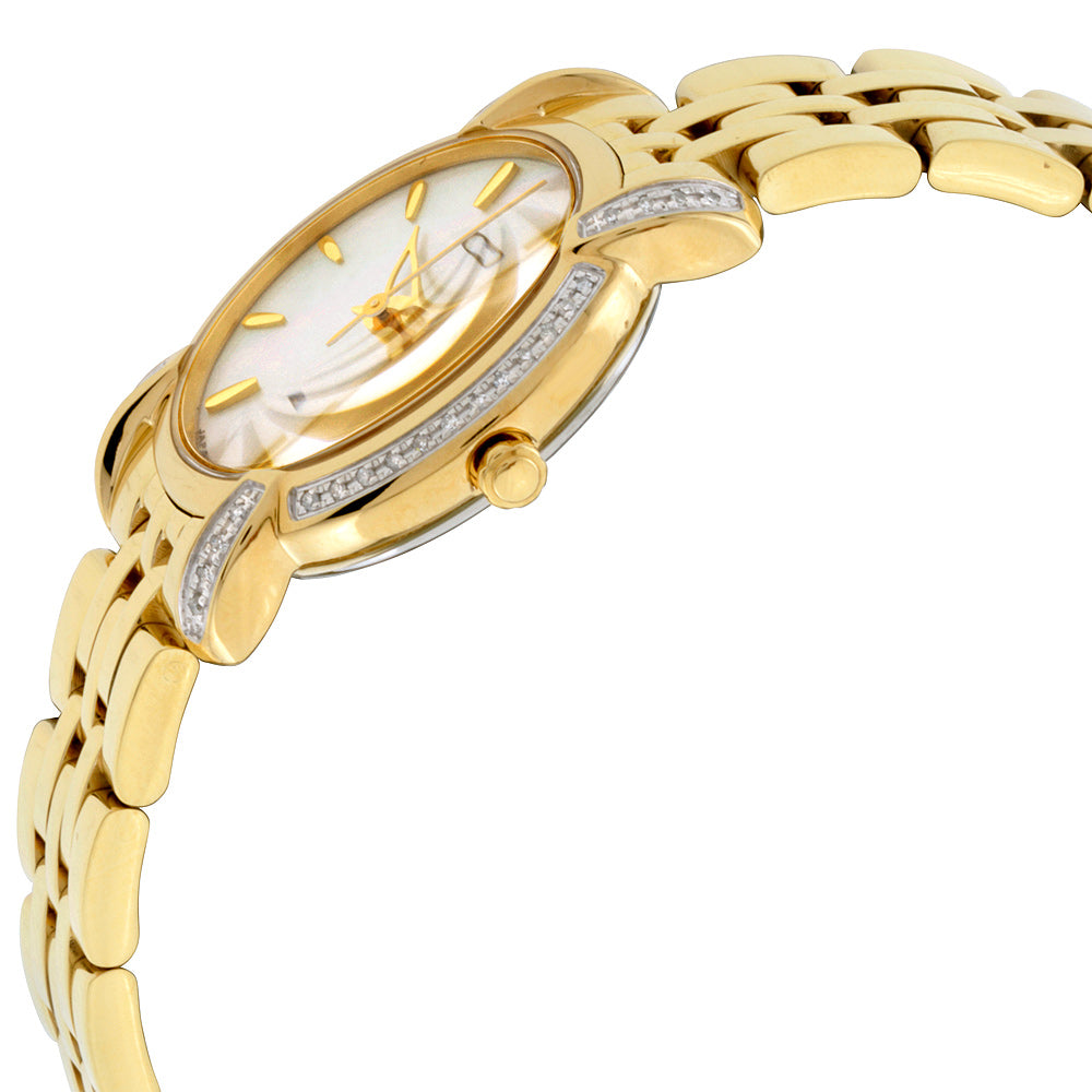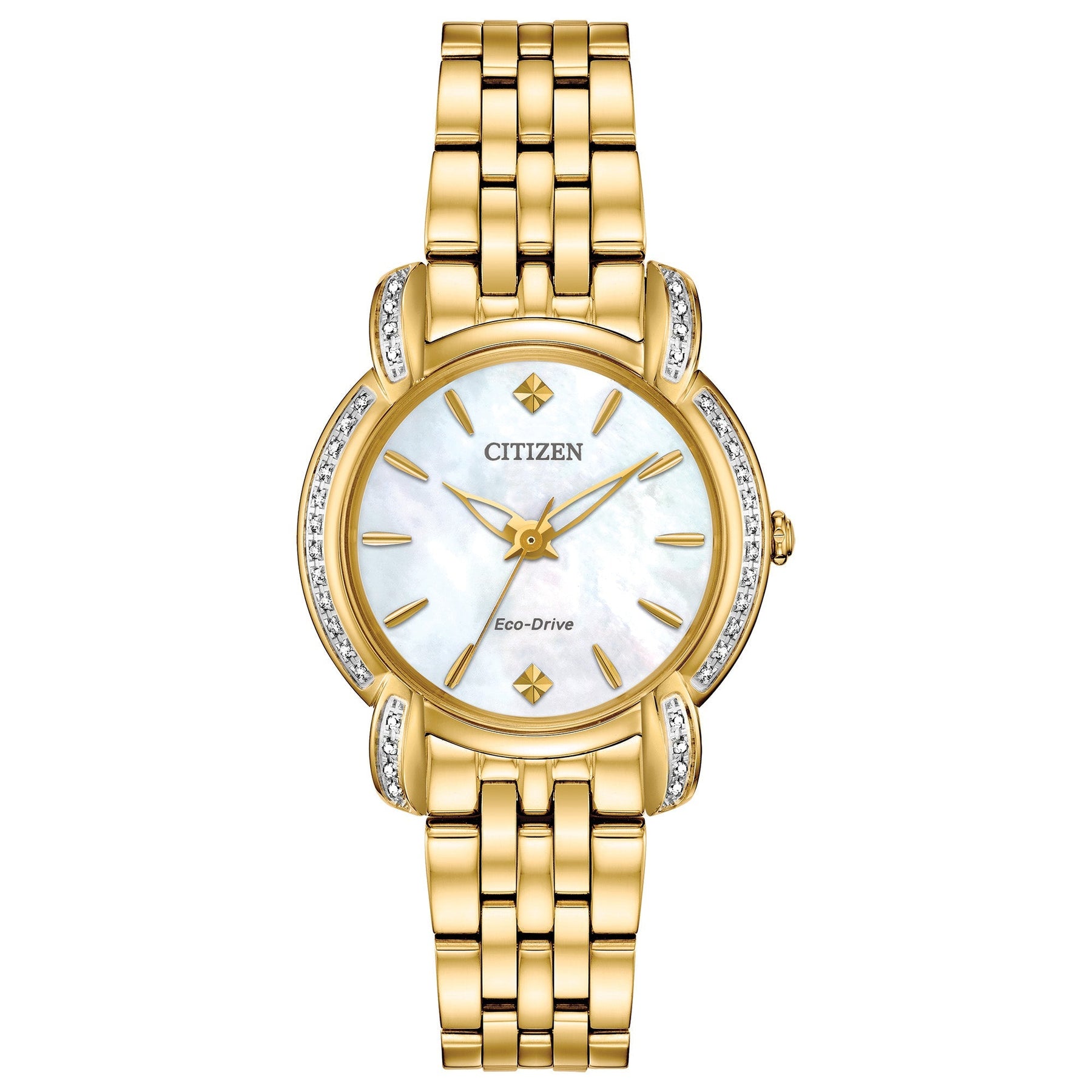 Case Material: Stainless Steel - Case Diameter: 30mm - Case Crystal: Sapphire Crystal Scratch Resistant - Water Resistance: 50 m (165 feet) - Dial Color: White - Band: Gold Stainless Steel Bracelet - Movement: Solar Powered Quartz Eco-Drive - Features: - Made in China
