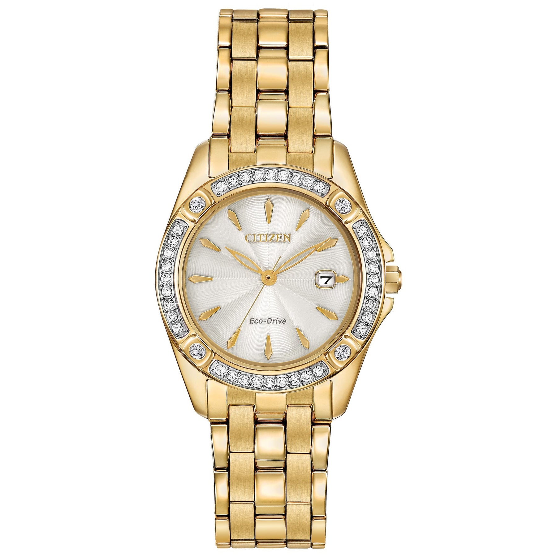 Case Material: Stainless Steel - Case Diameter: 28mm - Case Crystal: Mineral Crystal - Water Resistance: 30 m (100 feet) - Dial Color: Mother-of-Pearl - Band: Gold Stainless Steel Bracelet - Movement: Solar Powered Quartz Eco-Drive - Features: Date - Made in China