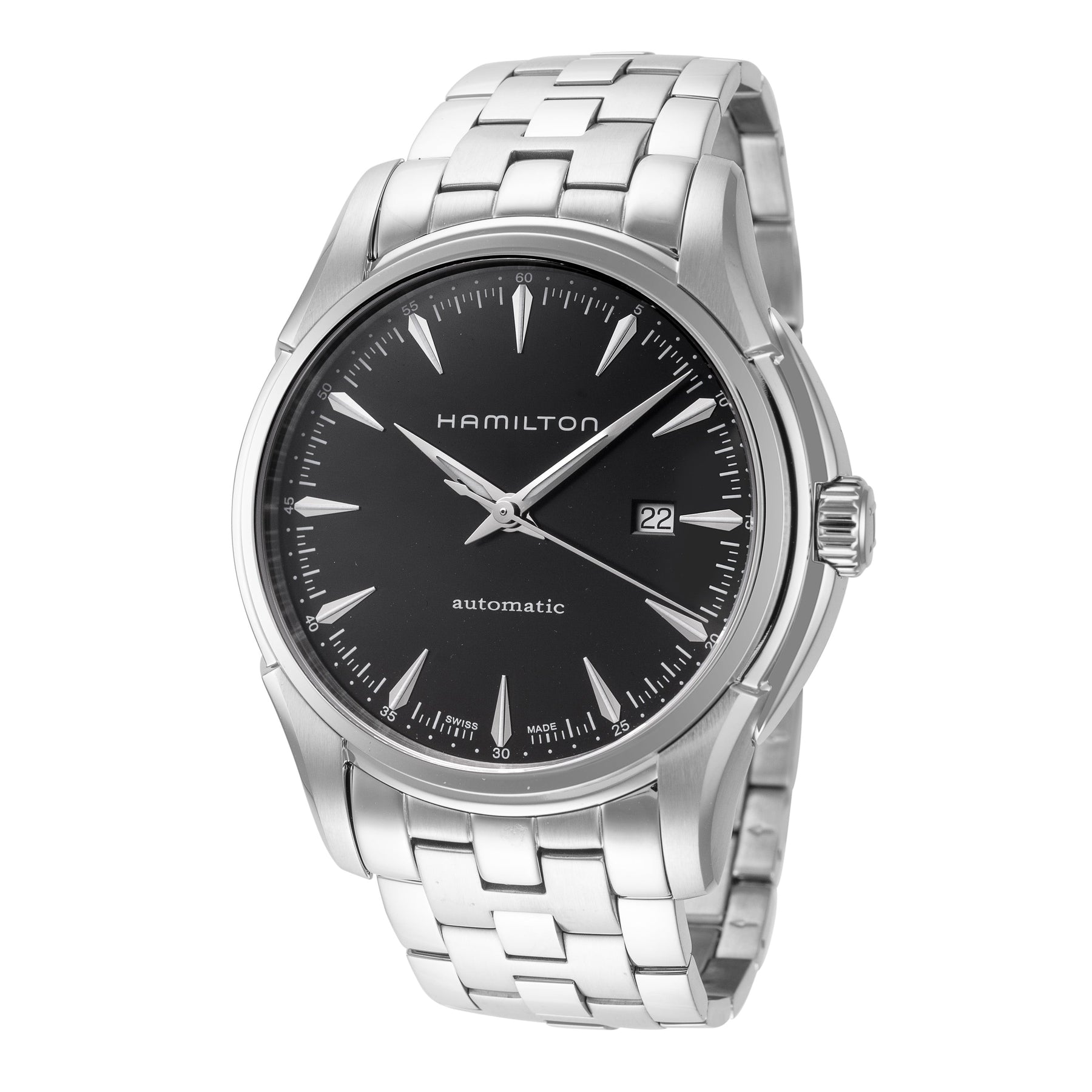 Collection Name: Jazzmaster, Case Shape: Round, Case Material: Stainless Steel, Case Width (mm): 44, Case Crystal: Sapphire Crystal Scratch Resistant, Case WAter Resistance: 100 m (330 feet), Dial Color: Black, Band Type: Bracelet, Band Material: Stainless Steel, Band Clasp: Deployment Clasp, Movement Type: Automatic, Country of Origin: Made in Switzerland