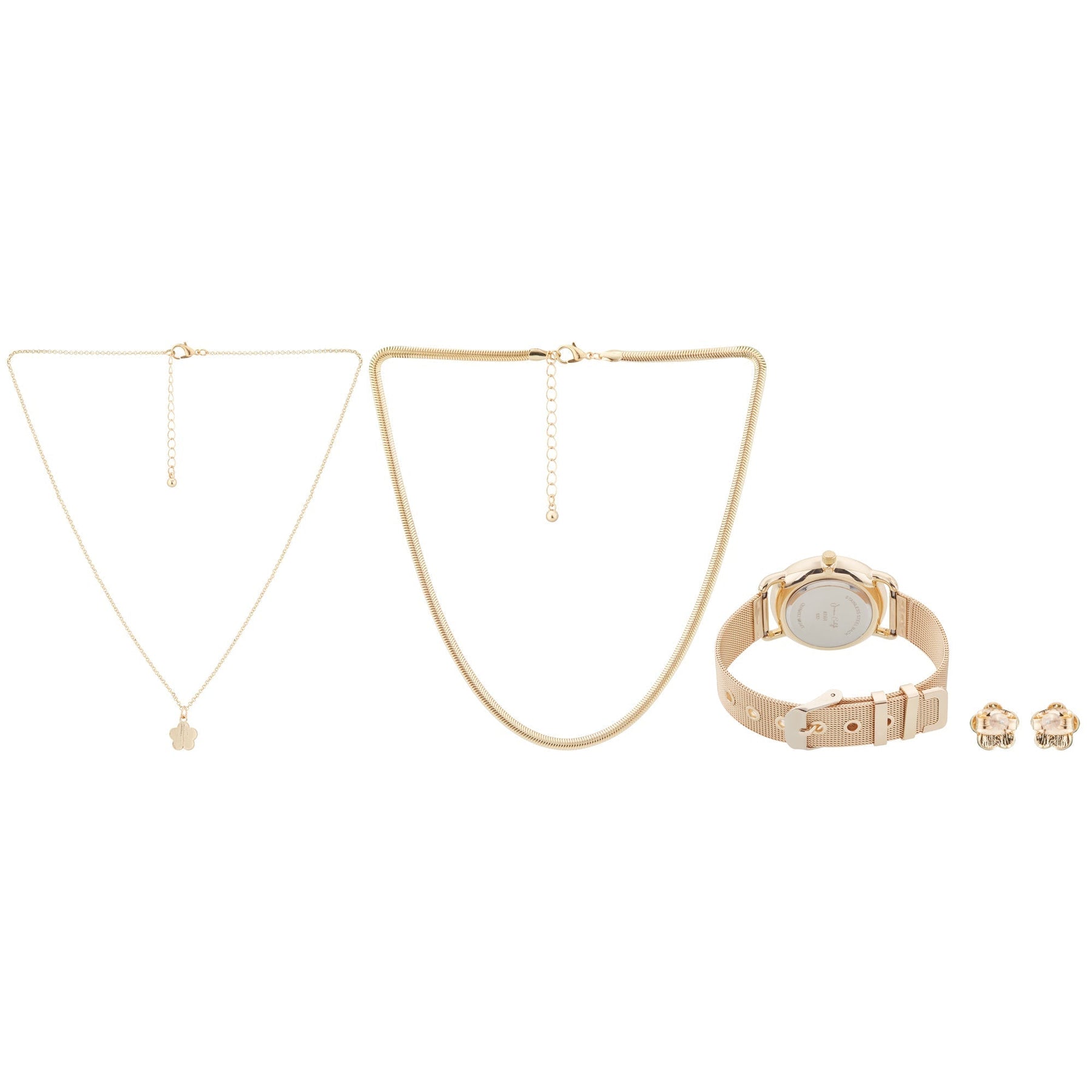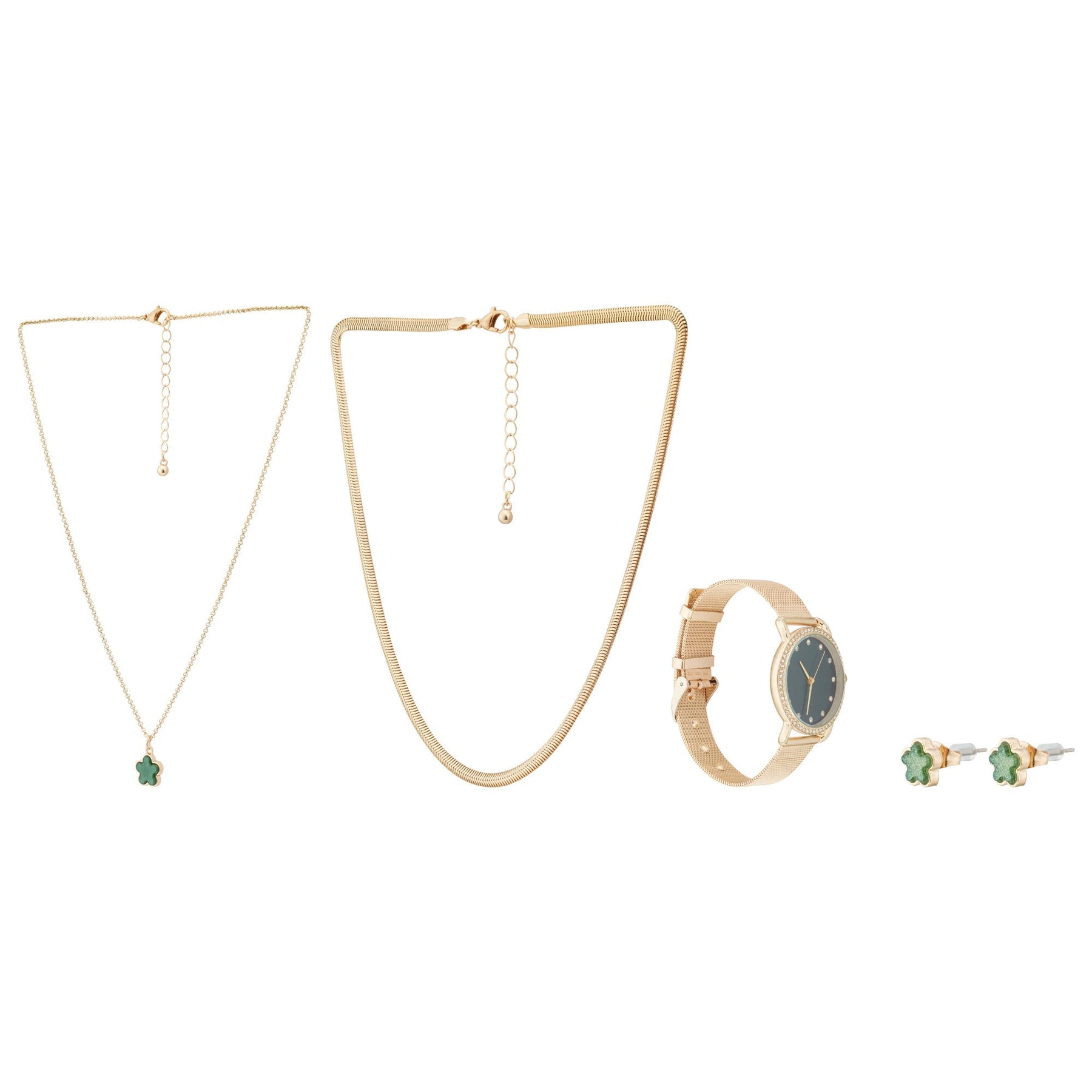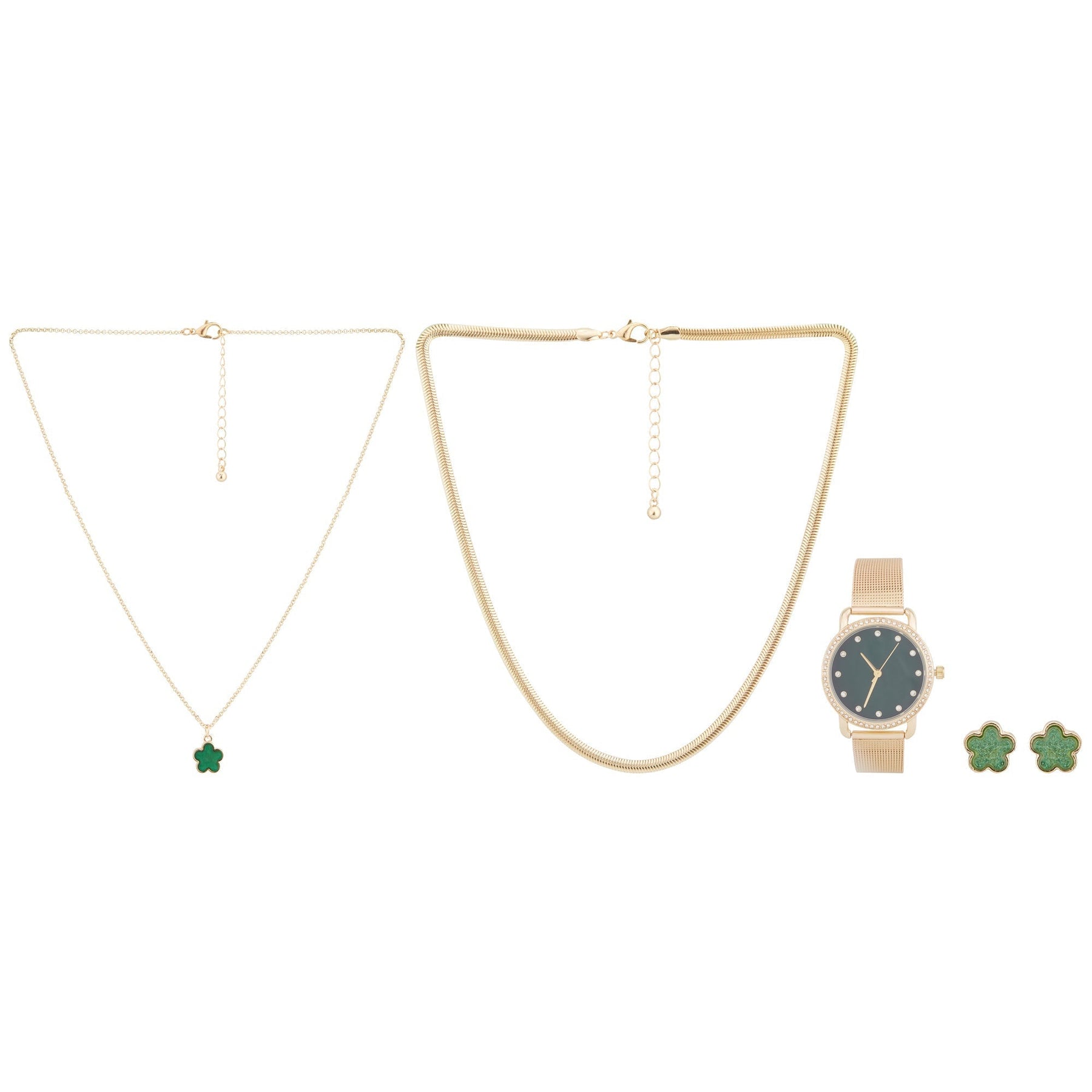 This watch and jewelry set is perfect for any happening occasion. The watch has a sleek design with a Malachite tone face and crystal stone bezel. The matching green Malachite imitation flower charm cable necklace and heart studs with a layered snake chain promotes positive changes in life. A great gift for someone help them increase determination and positive energy. Style #A1551G-42-X27