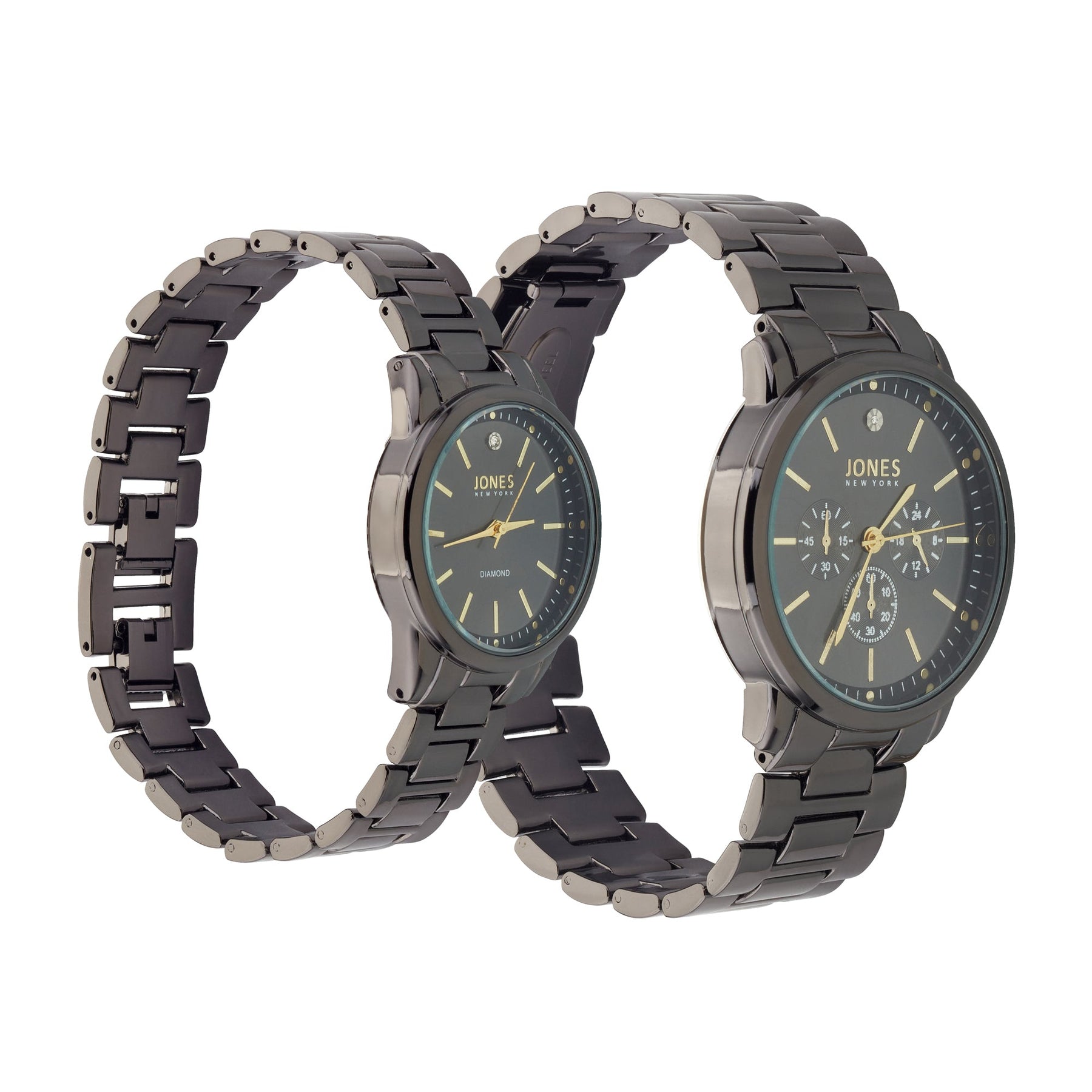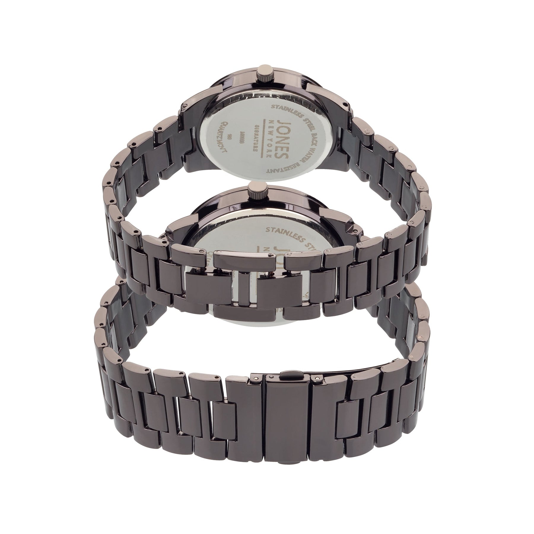 The Jones New York 2 piece analog watch set is a perfect gift for couples who love staying on time. This set includes two elegant watches crafted with black tone metal and featuring a modern analog design. Both watches have a classic round face accentuated by a black band that rests on your wrist. The simple, contemporary design allows them to be tastefully dressed up or dressed down with whatever the occasion calls for. The watches feature quartz movements for accuracy, a case thickness of 9mm and 8mm for a lightweight fit and reliable performance. With this gift set, you can ensure your loved ones are always on time and in style. Style M0023B-42-G02