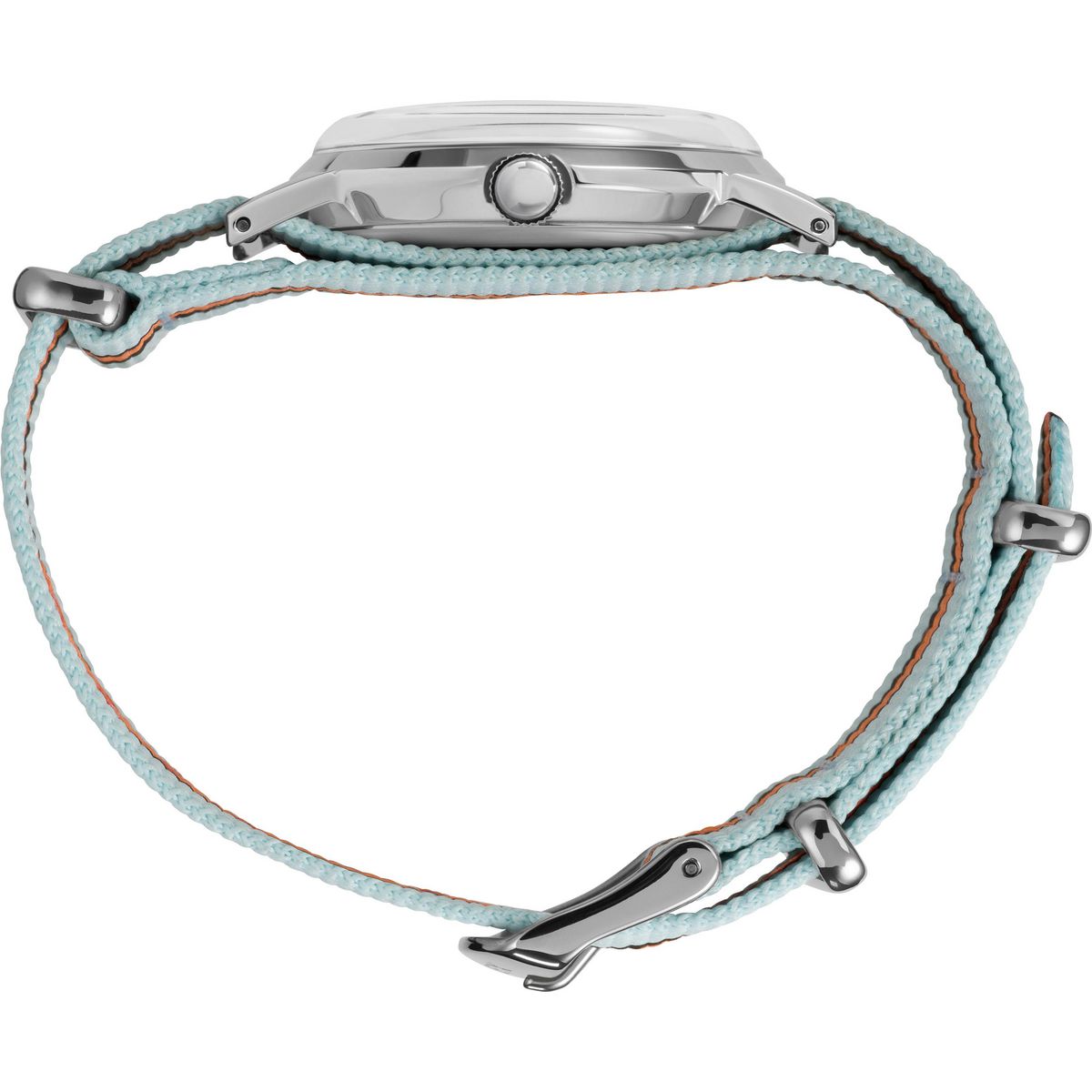 Case Material: Stainless Steel - Case Diameter: 34mm - Case Crystal: Acrylic Crystal - Water Resistance: 30 m (100 feet) - Dial Color: White - Band: Blue Fabric Strap - Movement: Manual-Wind - Features: - Made in China