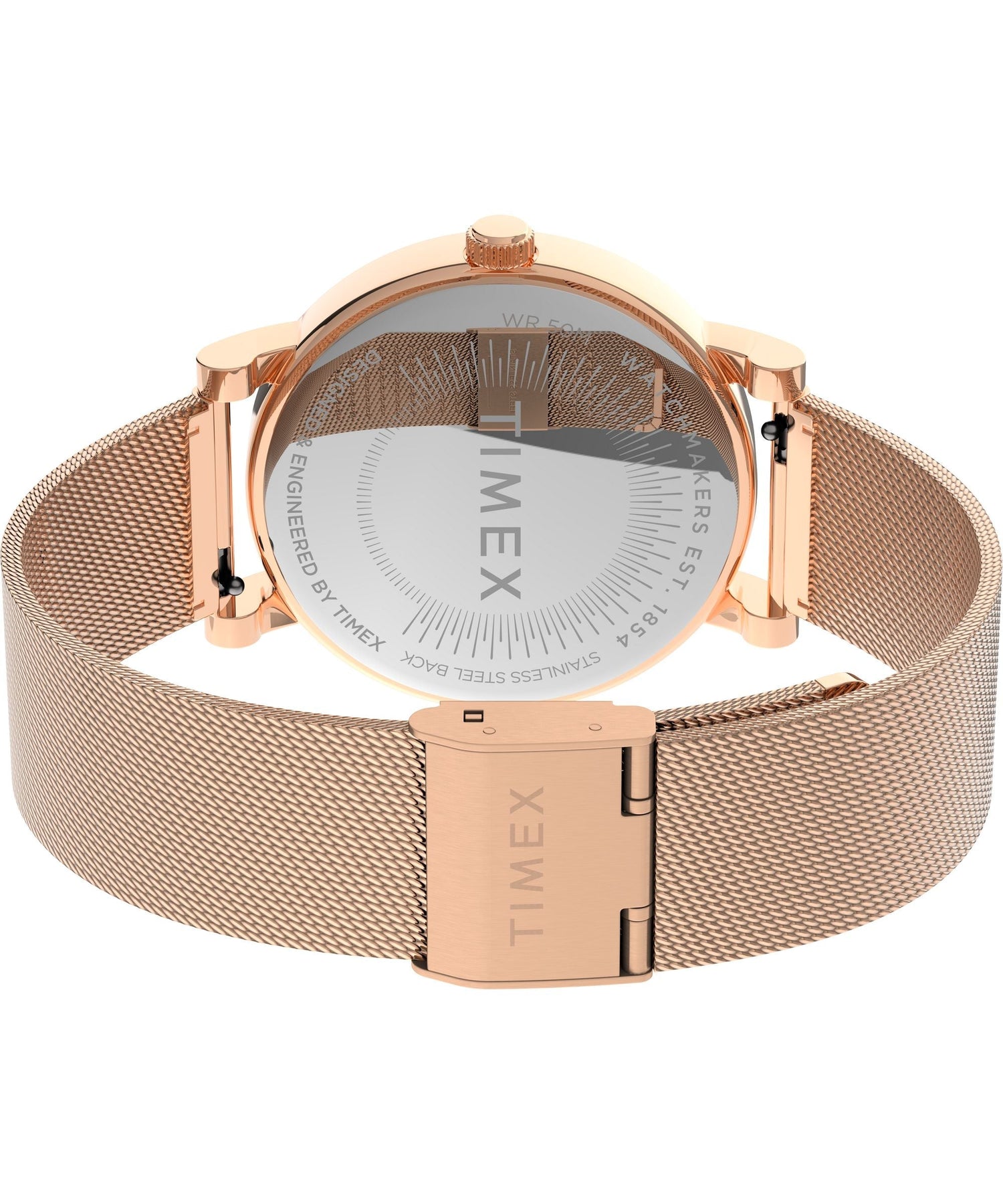 Case Material: Stainless Steel - Case Diameter: 38mm - Case Crystal: Mineral Crystal - Water Resistance: 30 m (100 feet) - Dial Color: White - Band: Rose Gold Stainless Steel Bracelet - Movement: Quartz - Made in China