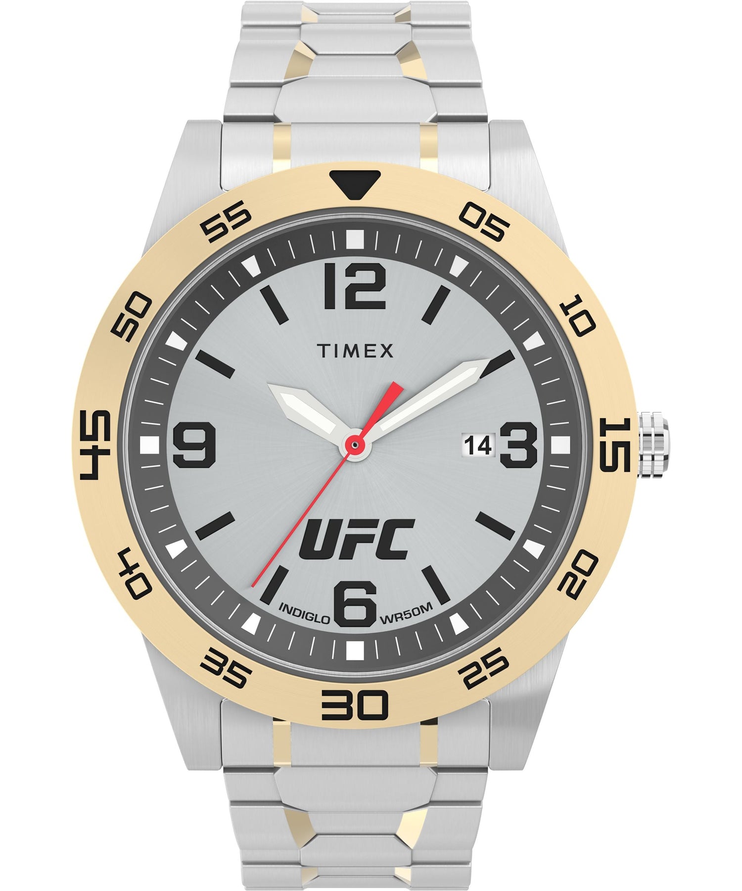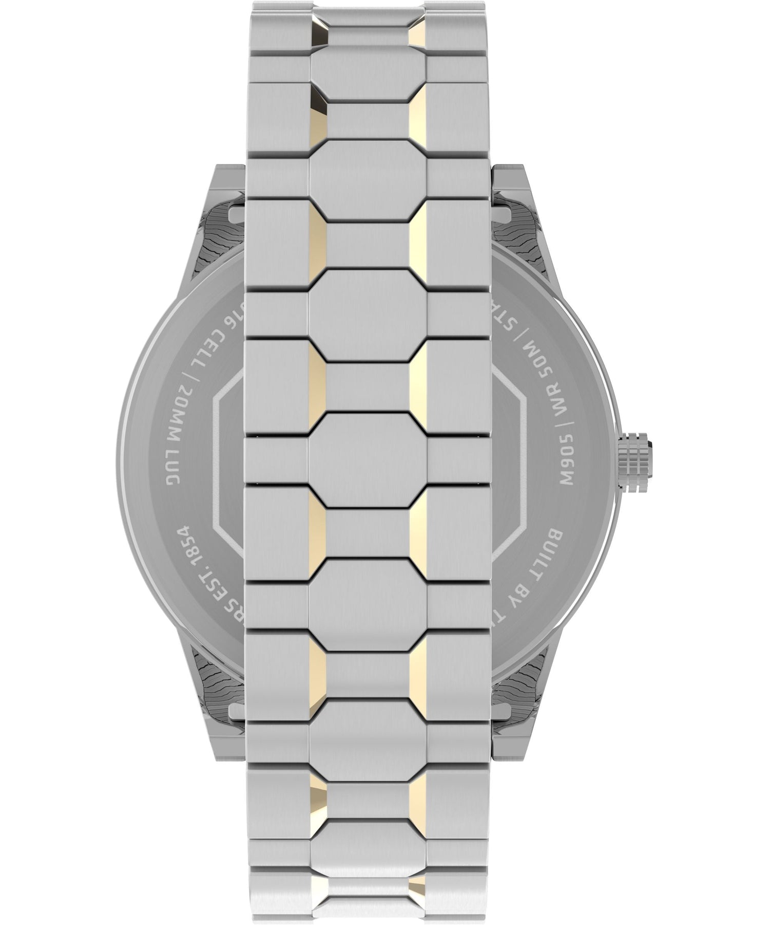 Case Material: Stainless Steel - Case Diameter: 42mm - Case Crystal: Mineral Crystal - Water Resistance: 50 m (165 feet) - Dial Color: Silver - Band: Silver and Gold Stainless Steel Bracelet - Movement: Quartz - Made in China