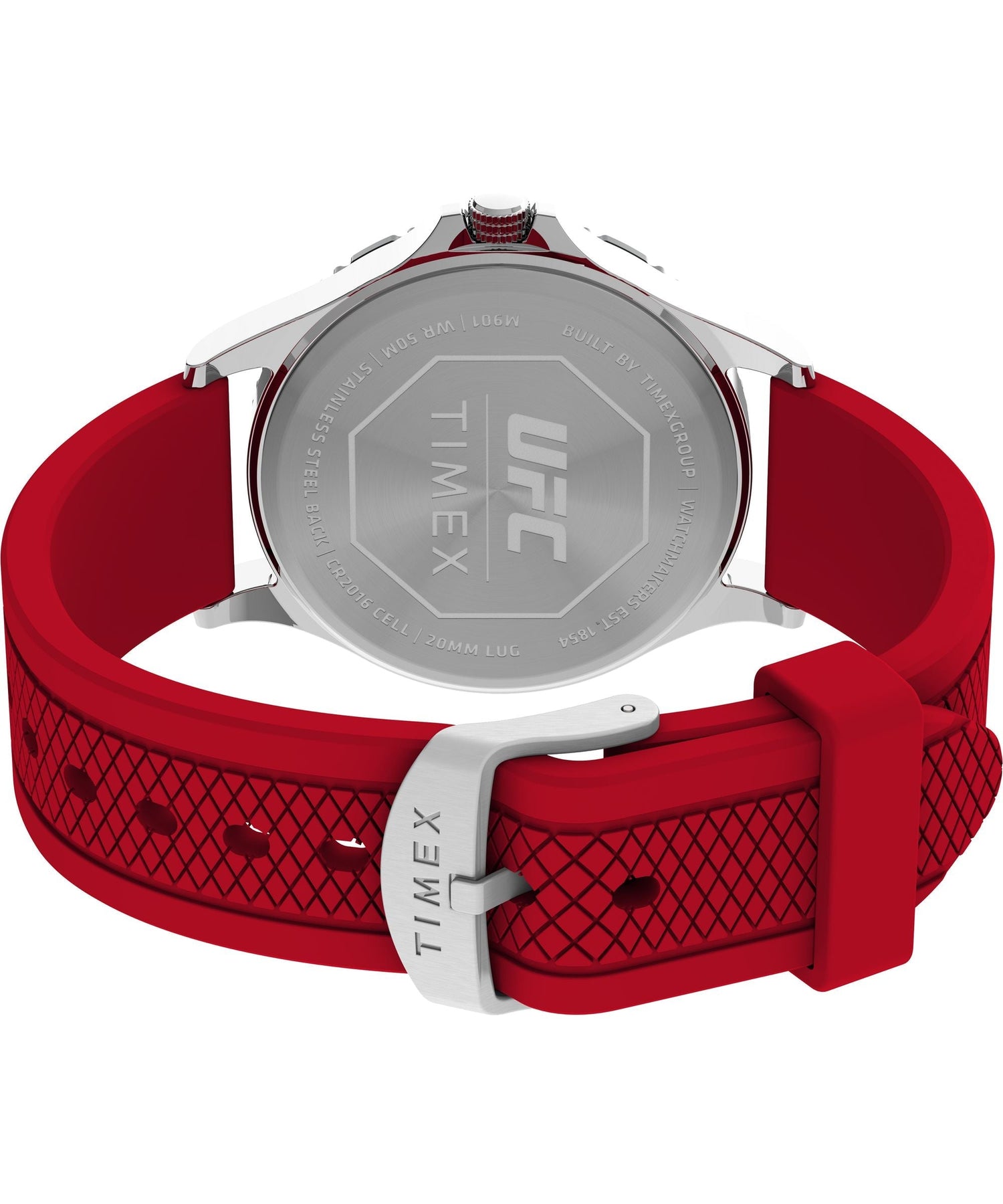 Case Material: Stainless Steel - Case Diameter: 42mm - Case Crystal: Mineral Crystal - Water Resistance: 50 m (165 feet) - Dial Color: Silver - Band: Red Silicone Strap - Movement: Quartz - Made in China