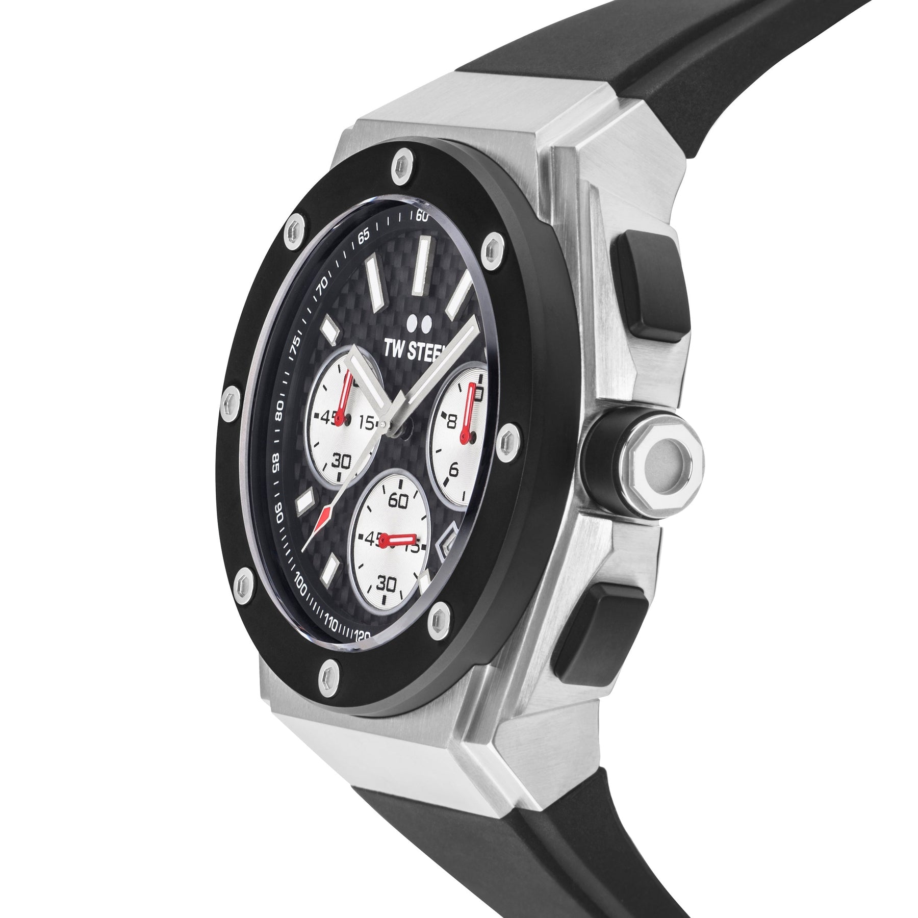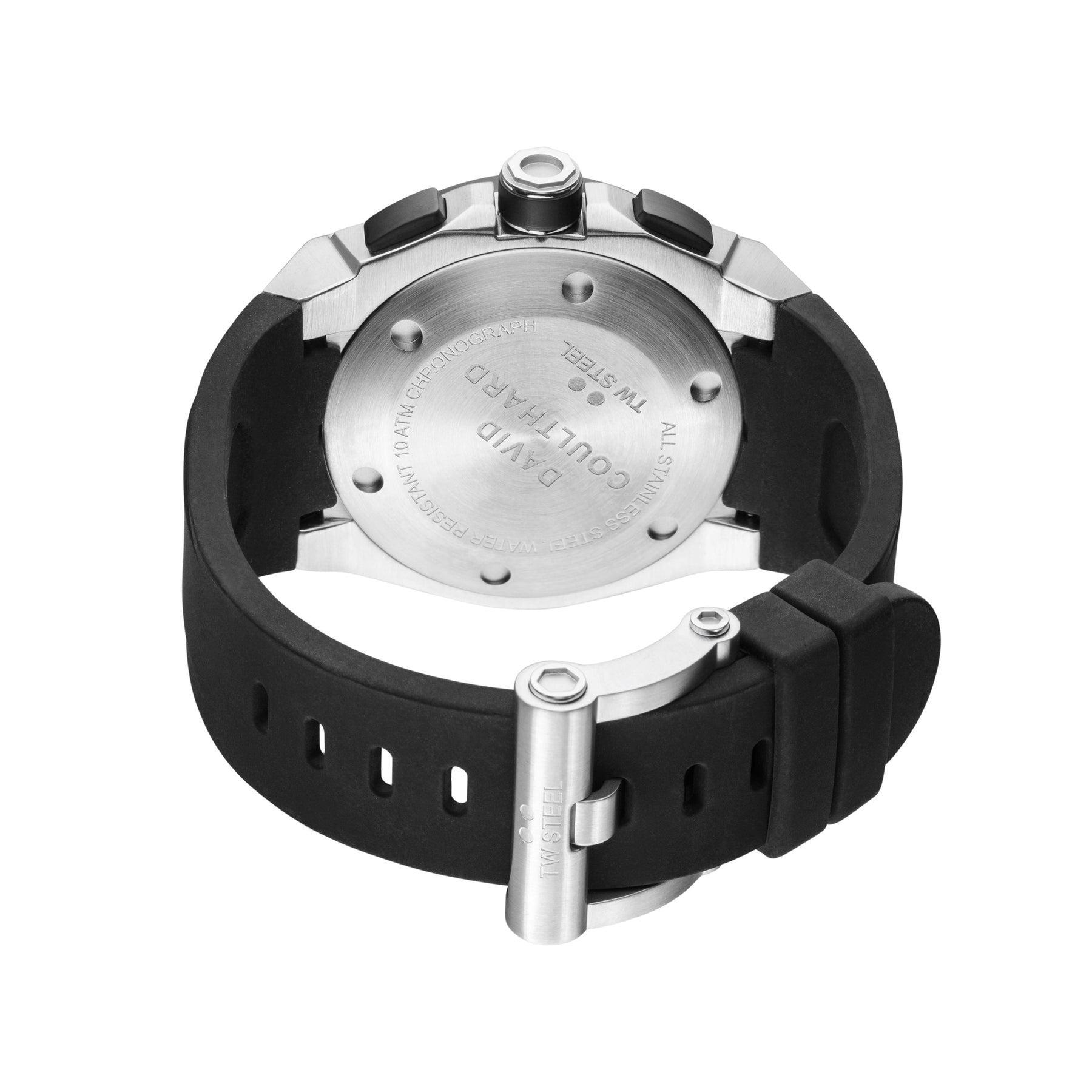 Case Material: Stainless Steel - Case Diameter: 44mm - Case Crystal: Mineral Crystal - Water Resistance: 100 m (330 feet) - Dial Color: Black - Band: Black Silicone Strap - Movement: Quartz - Features: Chronograph - Made in China