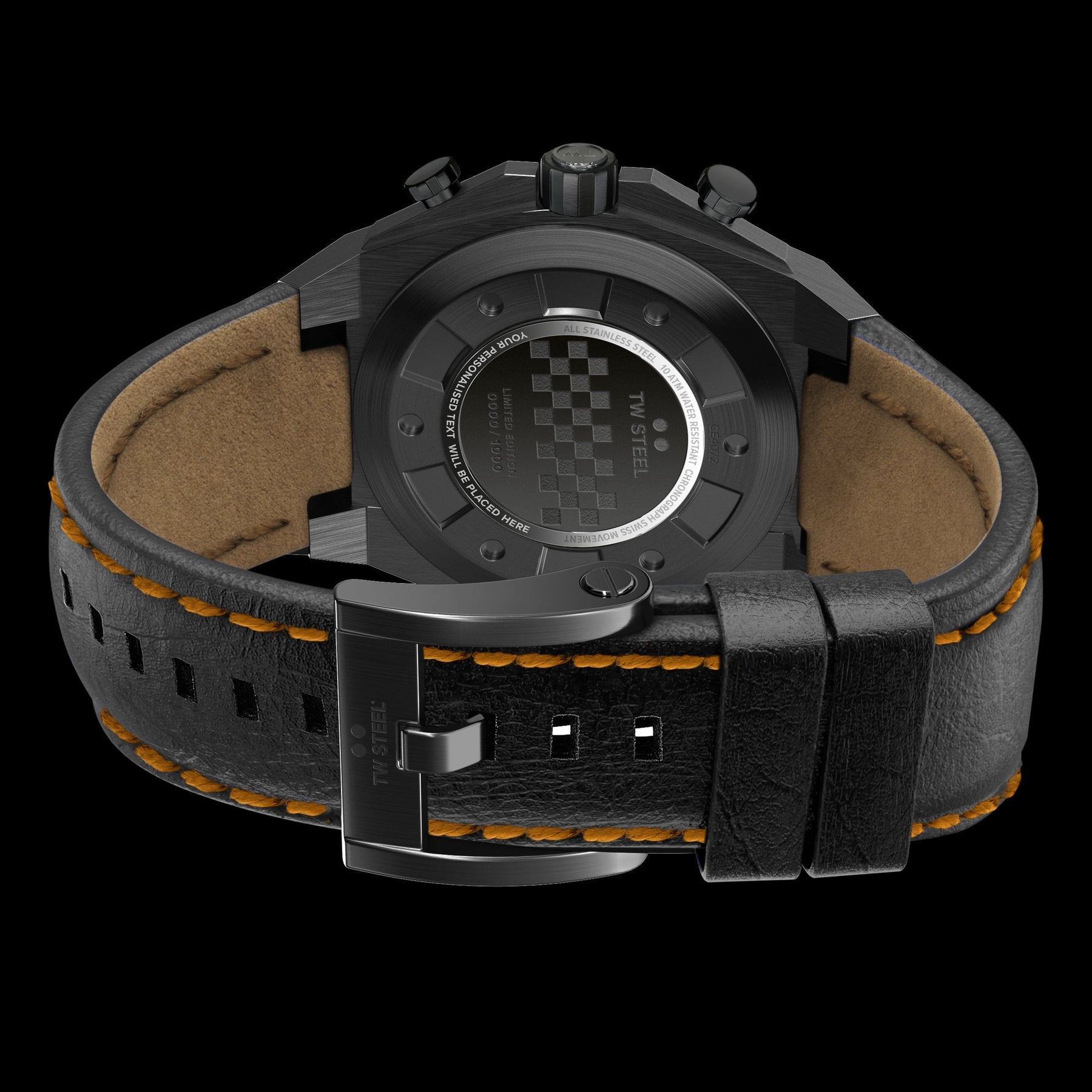 Case Material: Stainless Steel - Case Diameter: 44mm - Case Crystal: Mineral Crystal - Water Resistance: 100 m (330 feet) - Dial Color: Black - Band: Black Leather Strap - Movement: Quartz - Made in China