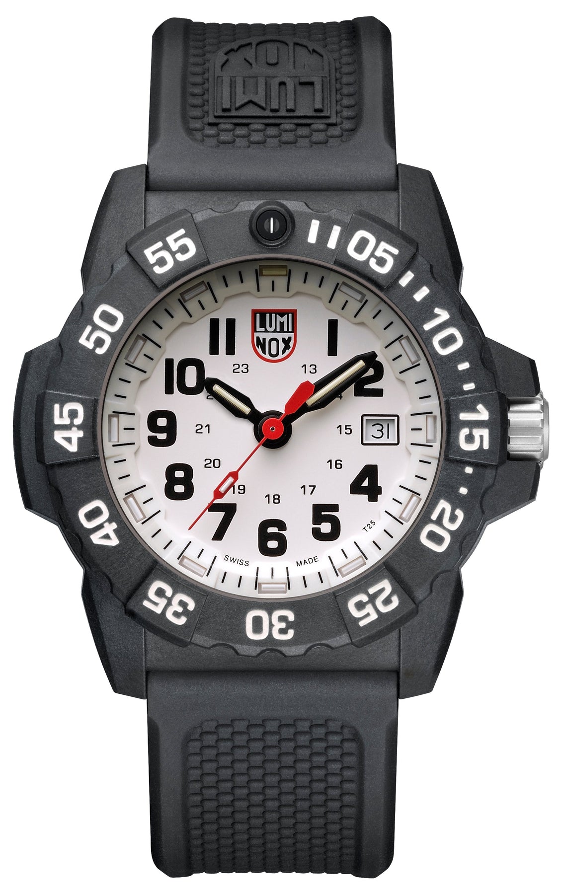 Case Material: Carbonox - Case Diameter: 45mm - Case Crystal: Mineral Crystal - Water Resistance: 200 m (660 feet) - Dial Color: White - Band: Black Rubber Strap - Movement: Quartz - Features: Date - Made in Switzerland