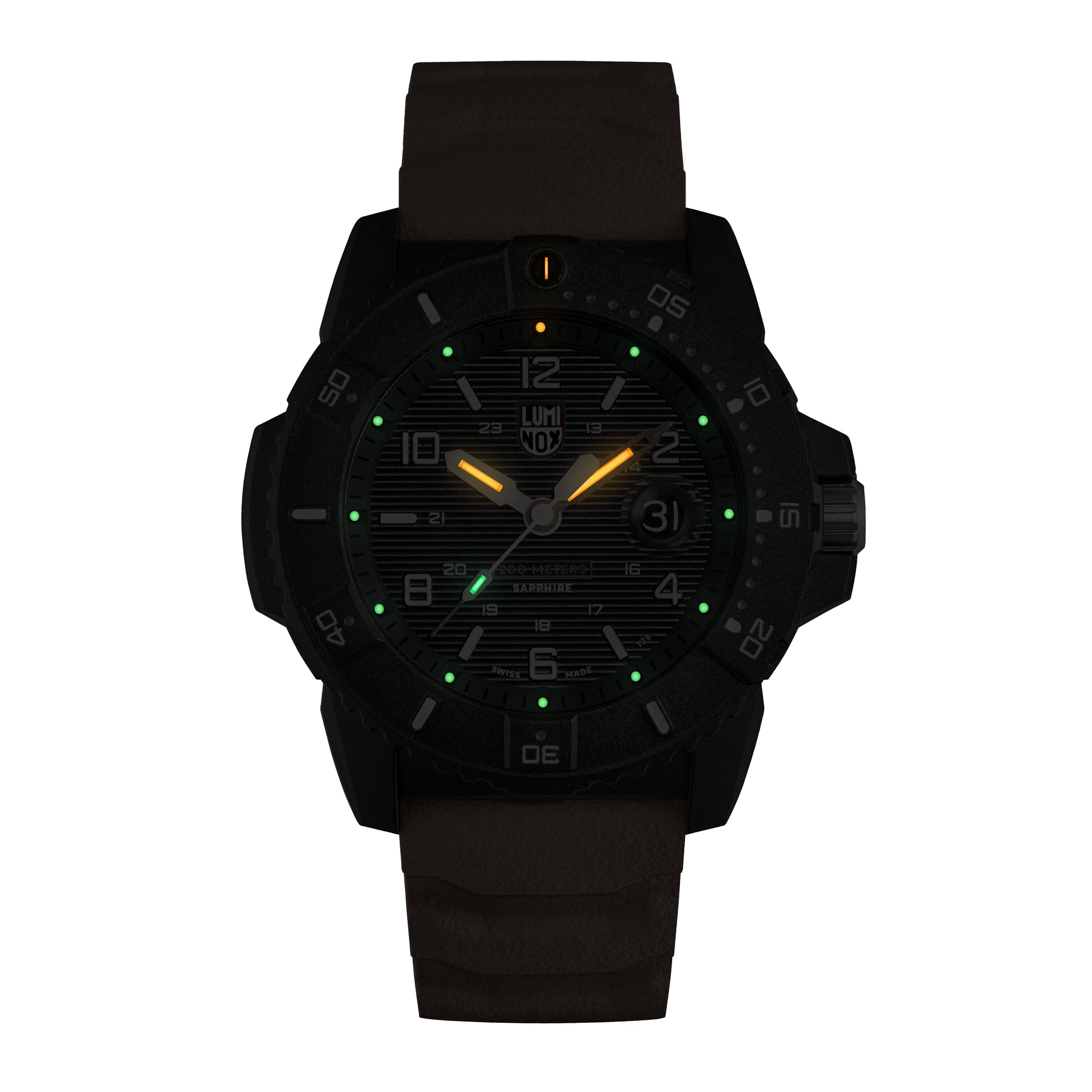 Case Material: Carbonox - Case Diameter: 45mm - Case Crystal: Sapphire Crystal Scratch Resistant - Water Resistance: 200 m (660 feet) - Dial Color: Blue - Band: Orange Rubber Strap - Movement: Quartz - Features: Date - Made in Switzerland