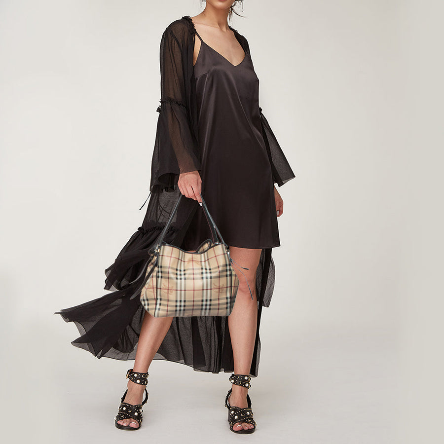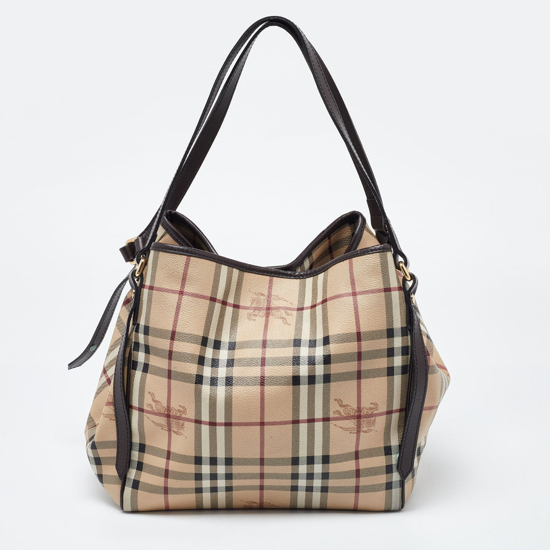 The Canterbury tote from Burberry will suffice your handbag needs with complete elegance. This tote is designed using beige brown Haymarket Check coated canvas, leather, and gold tone hardware. It is supported by dual handles and comes with a canvas lined interior.