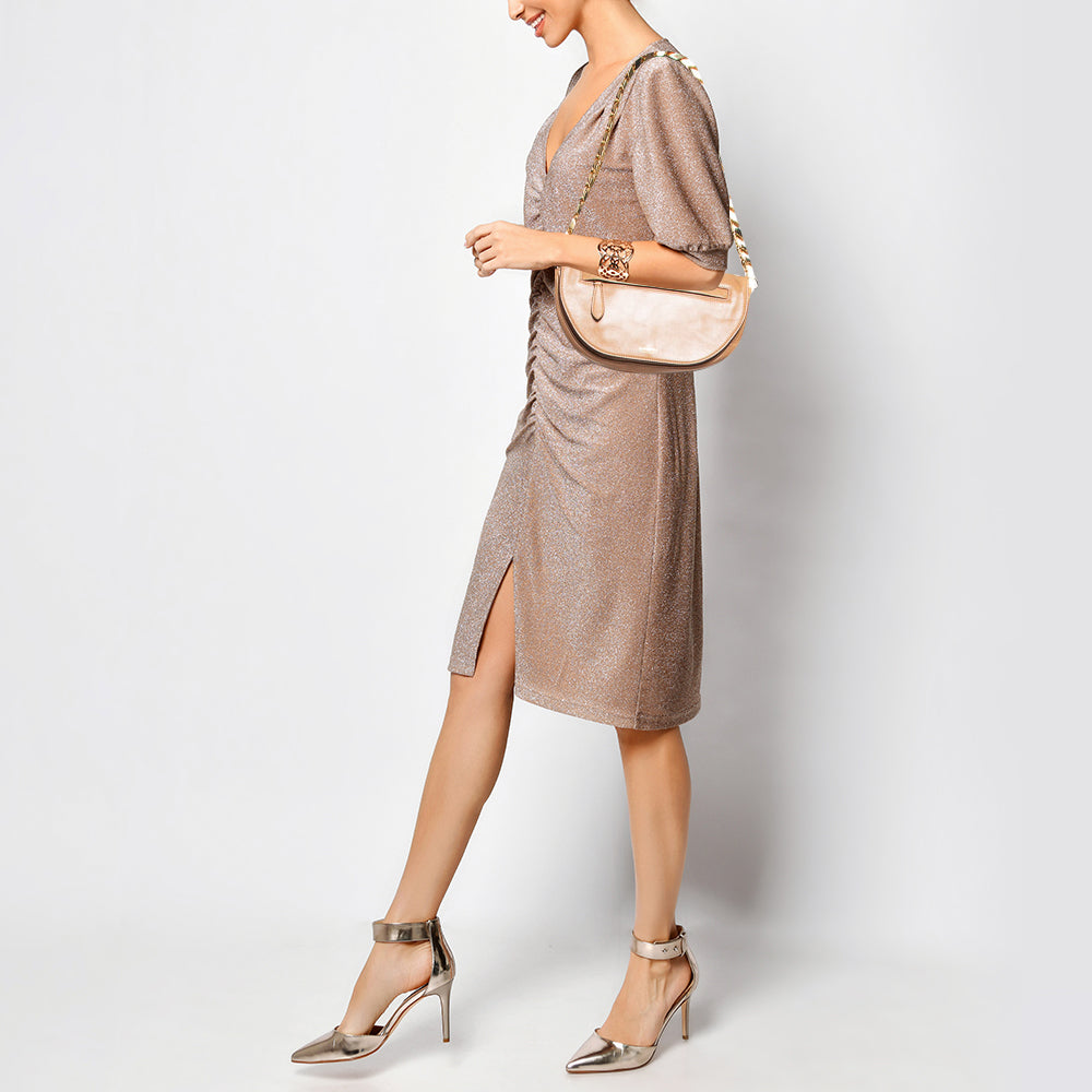 With an architectural shape, this Burberry Olympia bag resembles the crescent moon. The brand signature on the front lends to its instant identification, and it can be carried conveniently with a chain shoulder strap. Capturing the essence of feminity, it celebrates beauty through its creative design.