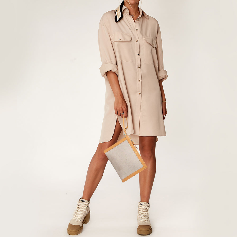 Keep your essentials effortlessly in this Burberry pouch. It features an elegant design in beige canvas and tan leather with a roomy interior.