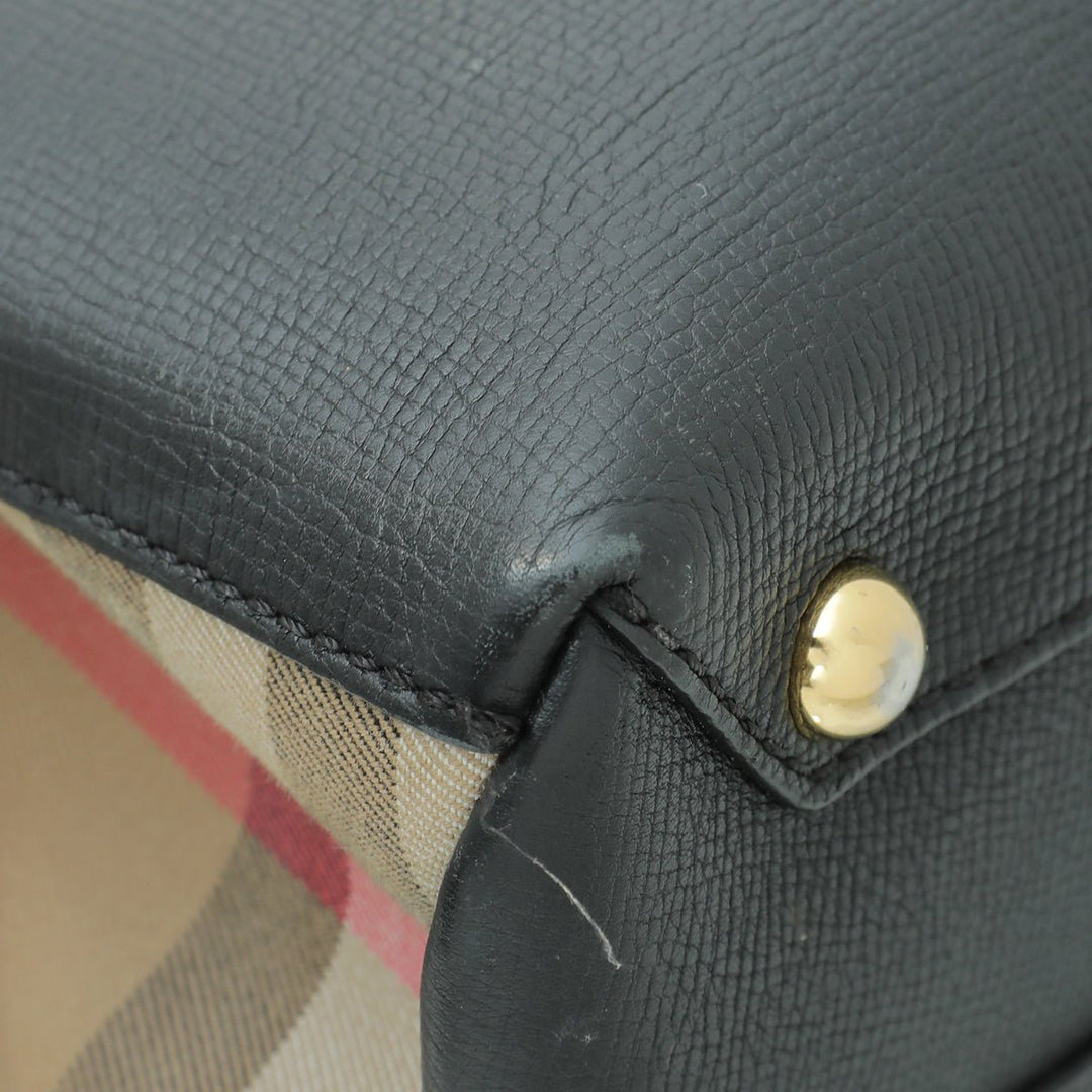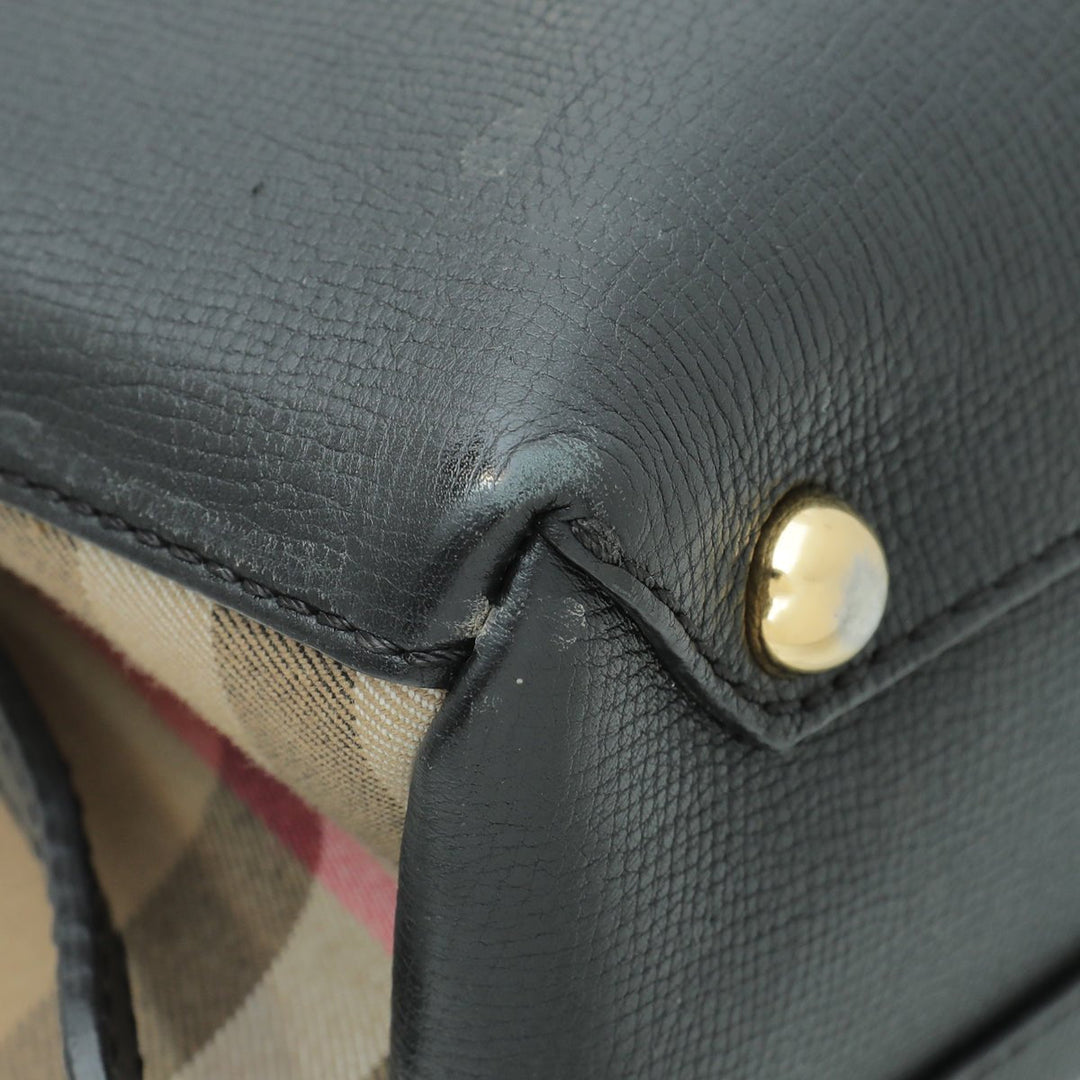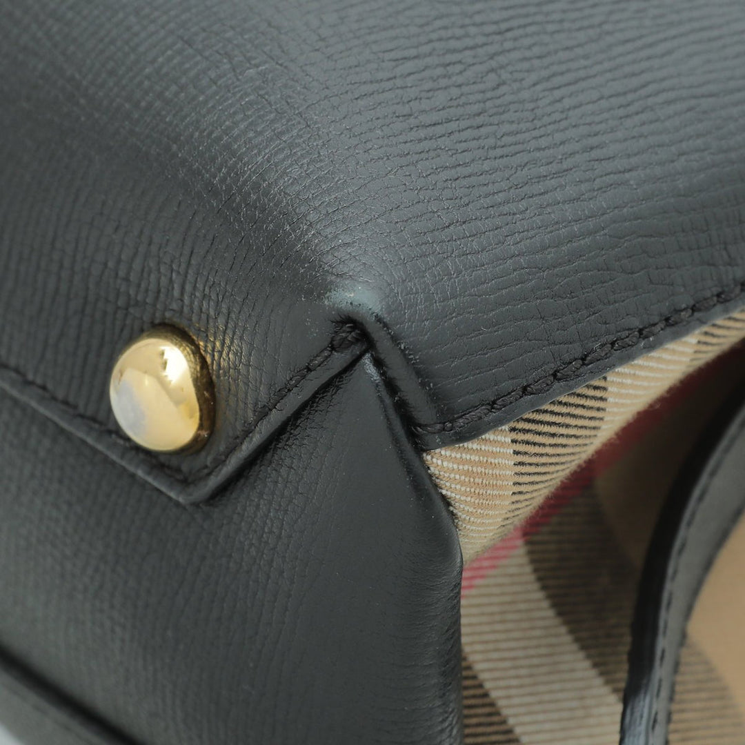 - Material: Black Leather and House Check Canvas Trim