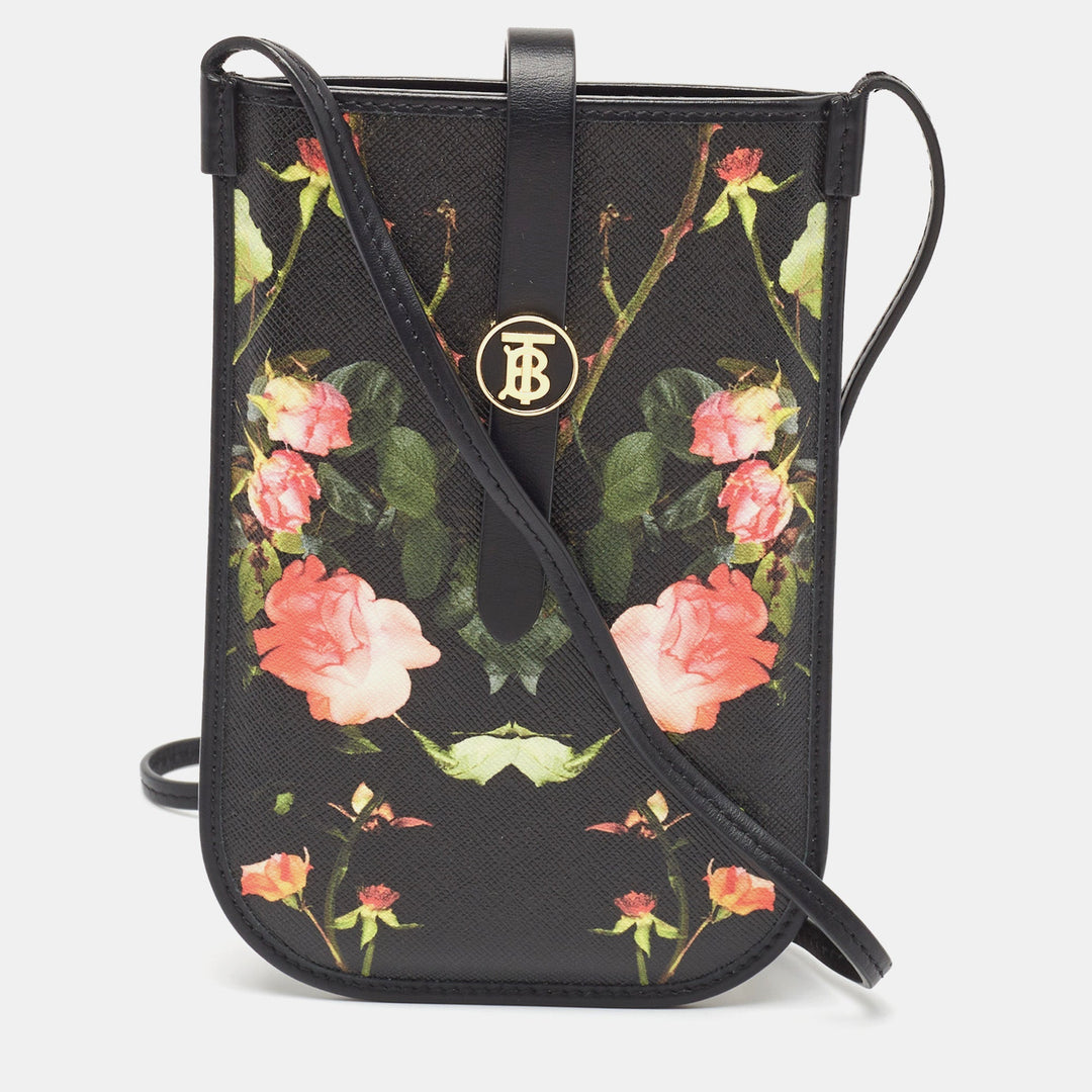 BURBERRY Black Floral Print Coated Canvas Anne Phone Pouch with Strap