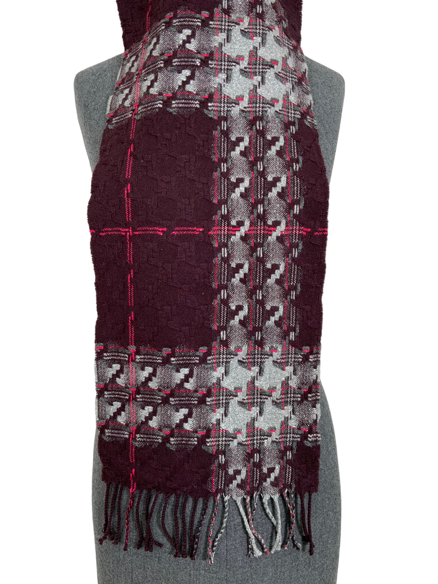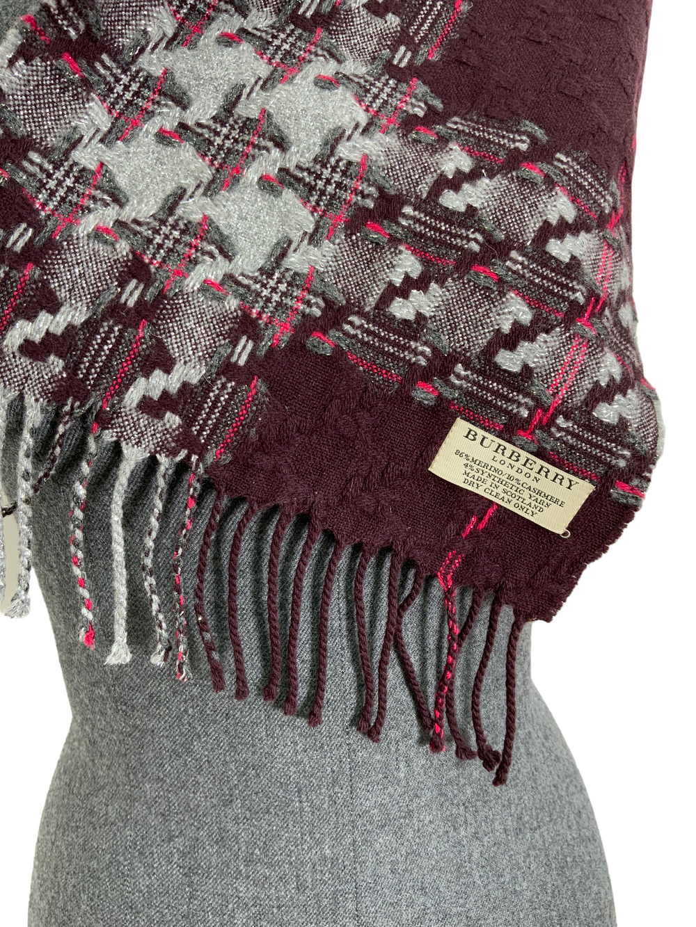 We the ity of this brand new Burberry Checkered Plaid Wool Scarf with Fringe featuring a plum, hot pink and metallic silver plaid graphic print with a fringe trim.