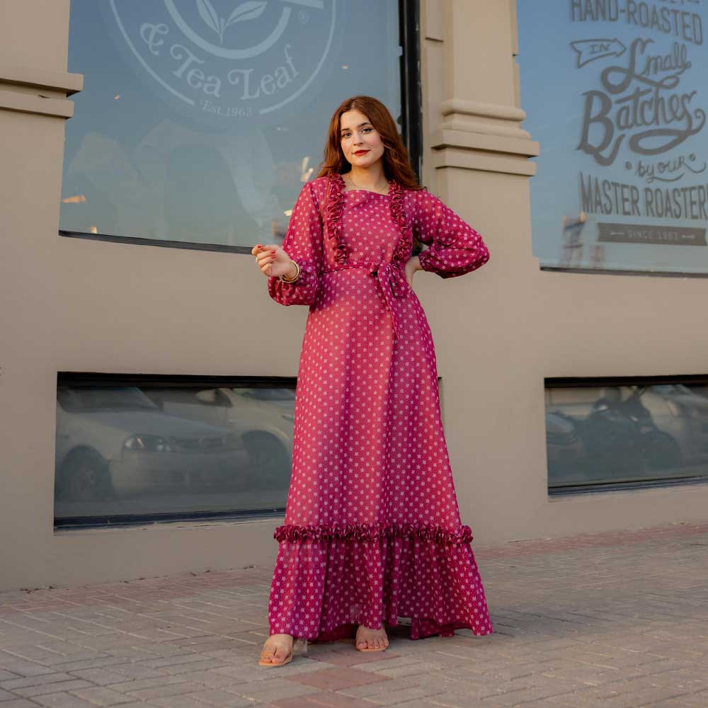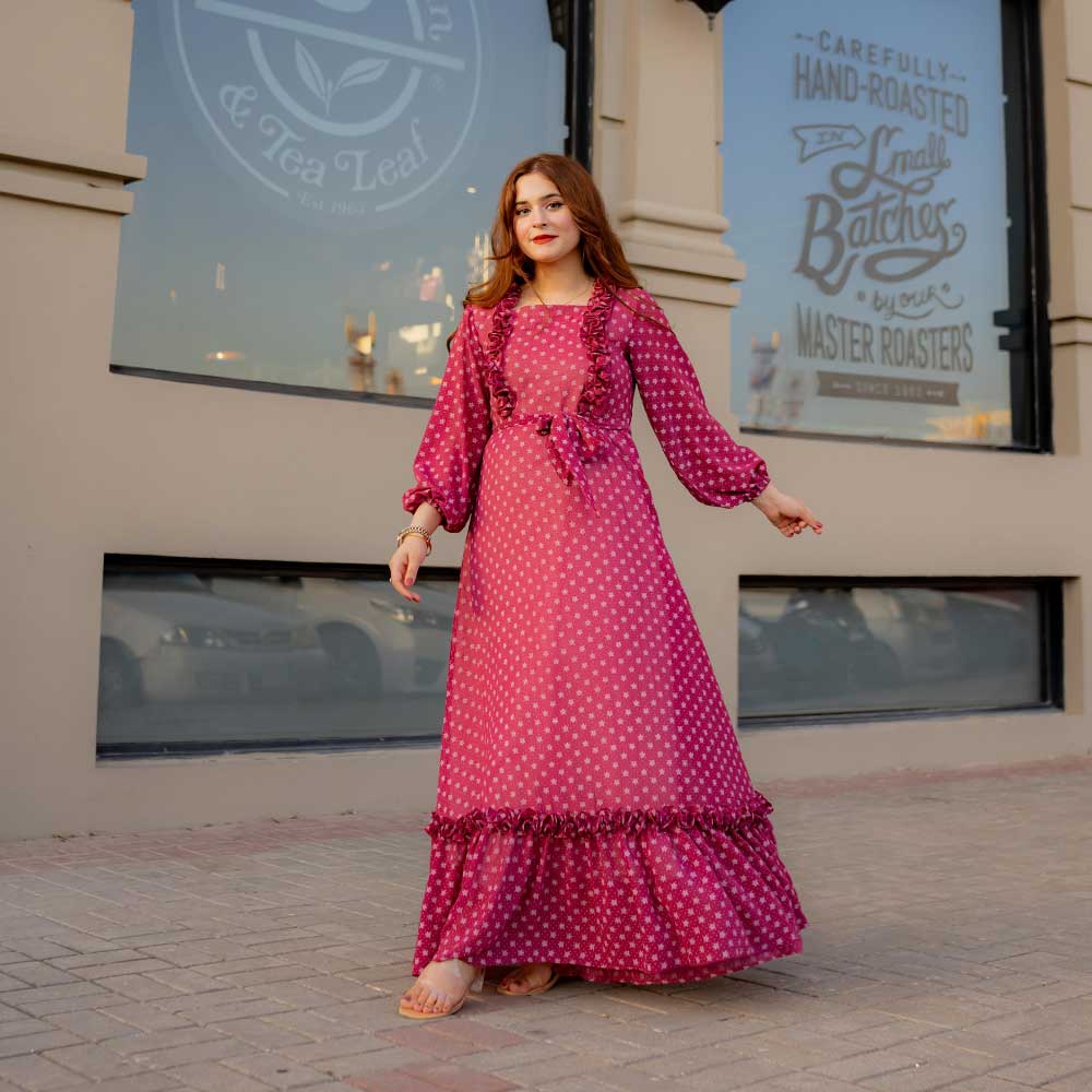 Embrace the alluring beauty of our delicately detailed Polka maxi dress. This enchanting piece celebrates the classic polka dot pattern, bringing a touch of vintage flair to modern-day fashion. Crafted from soft and flowing fabric, this lightweight dress ensures a delightful and breezy feel, making it a perfect fit for warm summer days and evening gatherings. Get ready to redefine chic with our sleek and structured beautiful sleeves.