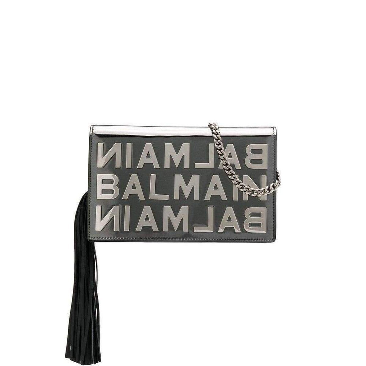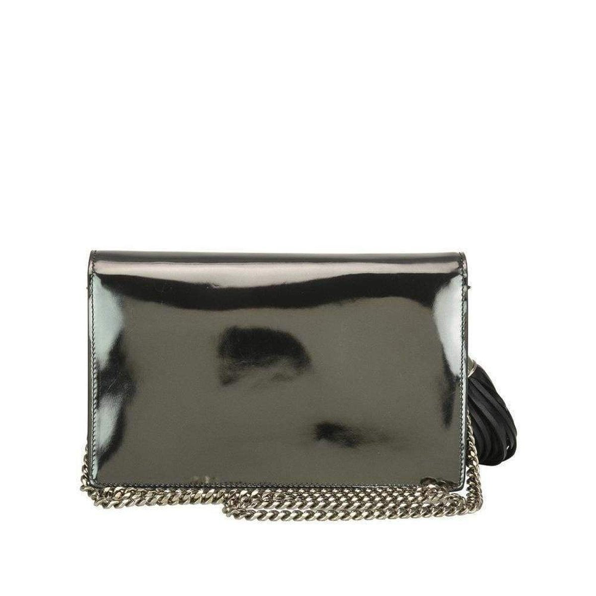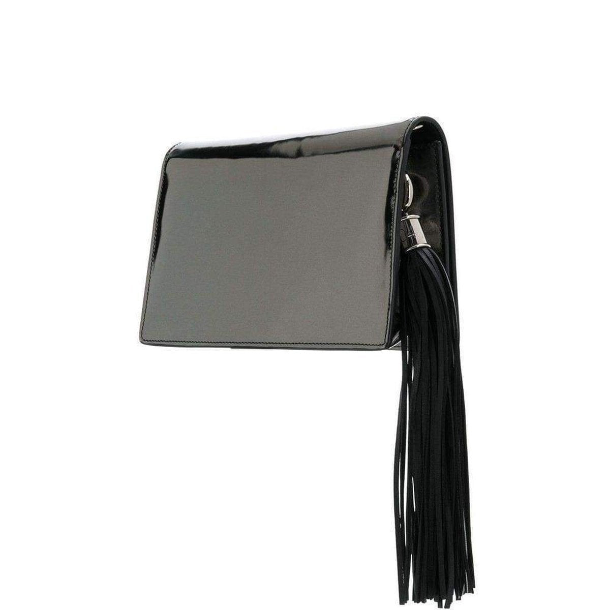 The overflap with magnet closure, the removable silver chain shoulder strap and the black leather tassel, complete the evening bag.
