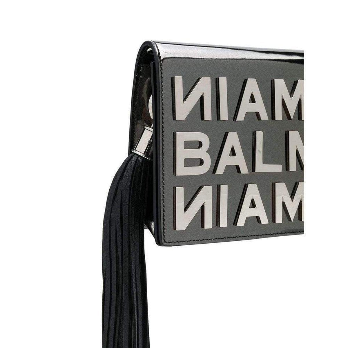 The silver metallic letters are applied on the shiny black leather bottom, shaping the brand.
