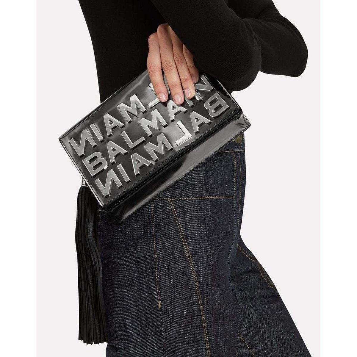 The Balmain clutch is bright, elegant and distinctive.
