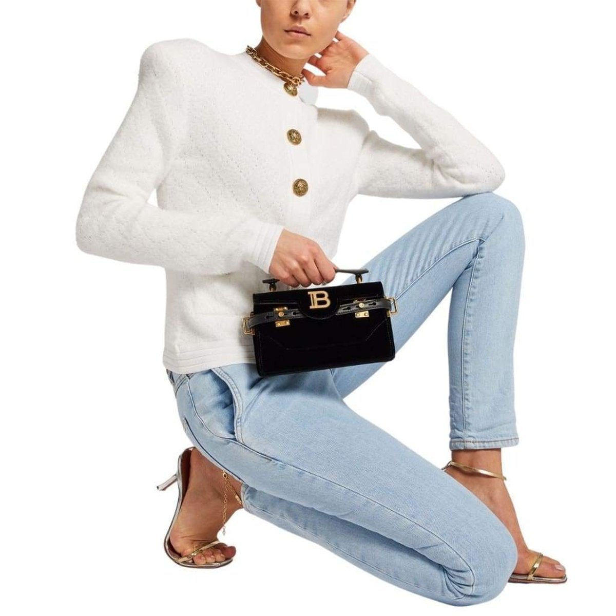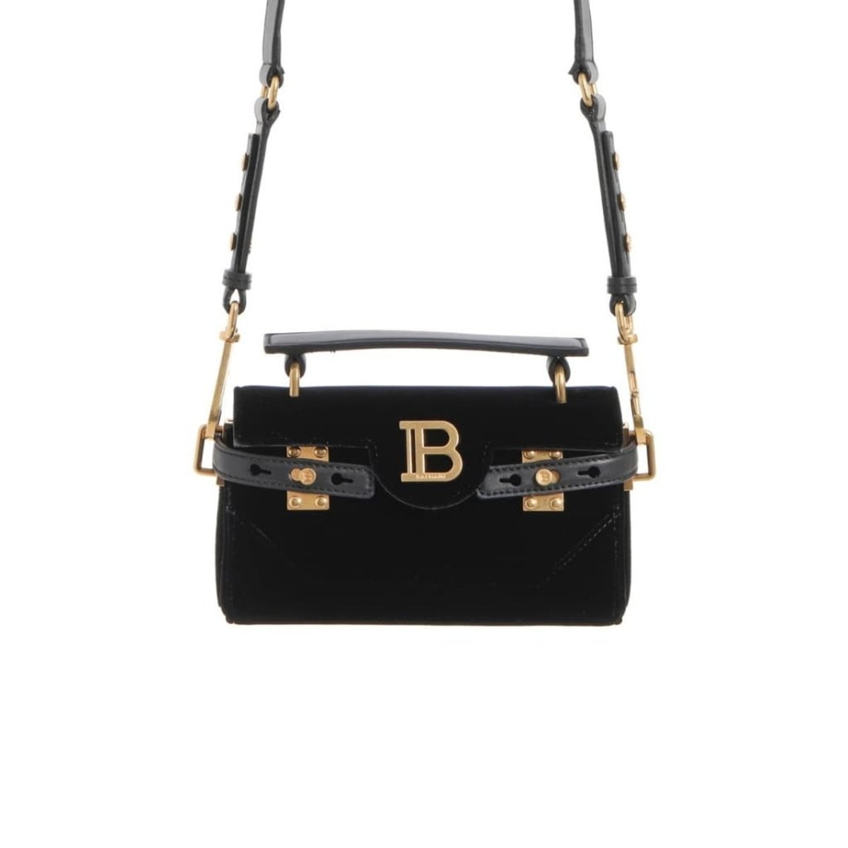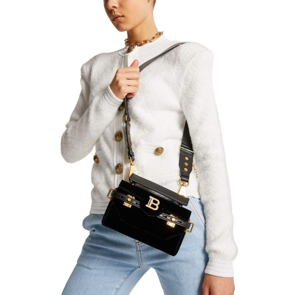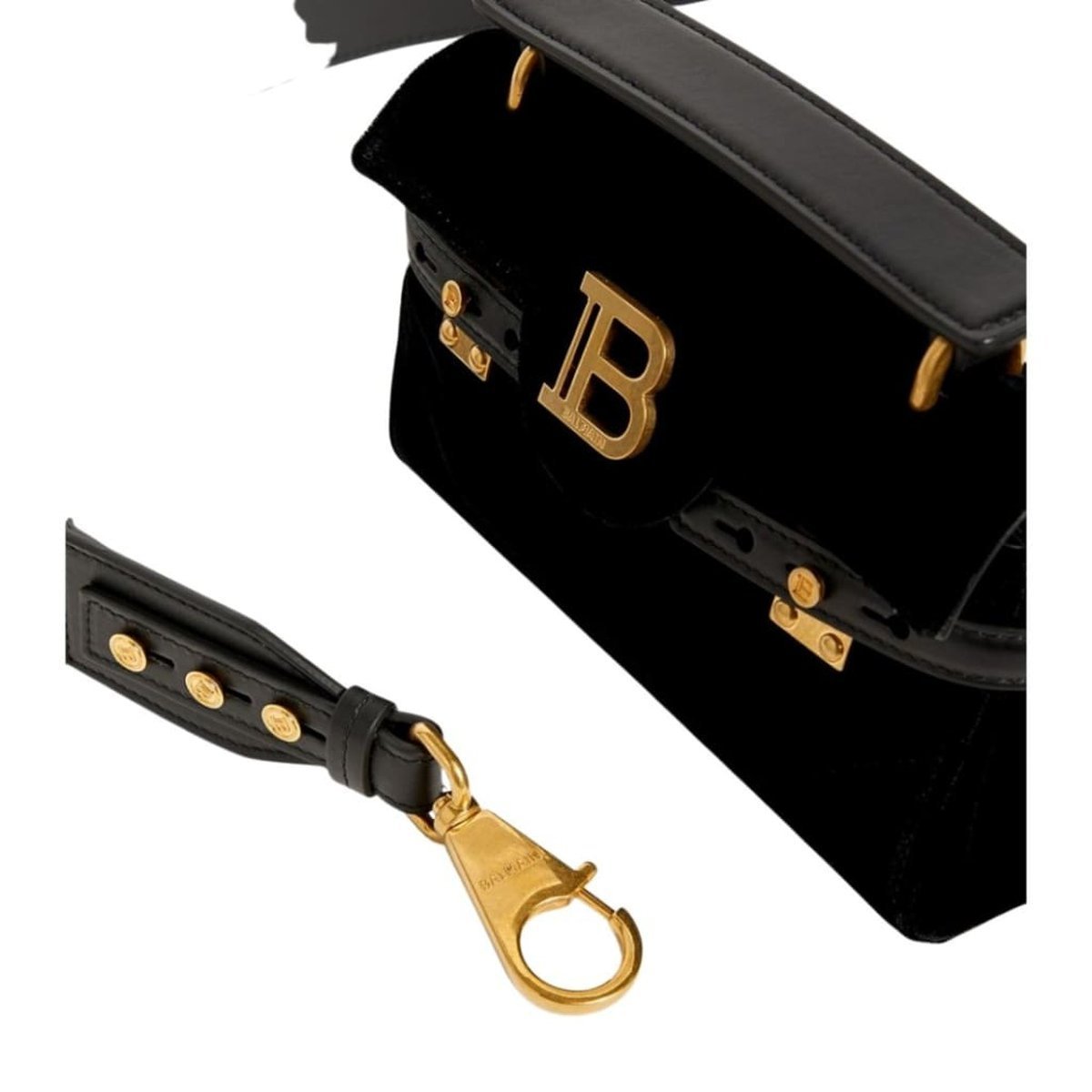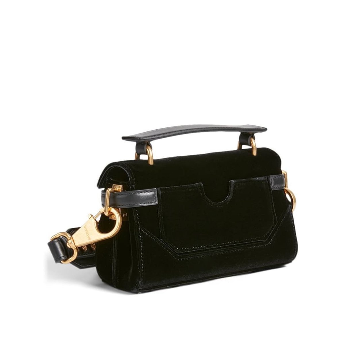 Crafted with a velvet finish, this bag features an adjustable and detachable leather shoulder strap with BALMAIN-engraved lobster clasps and an adjustable placket adorned with signature rivets.