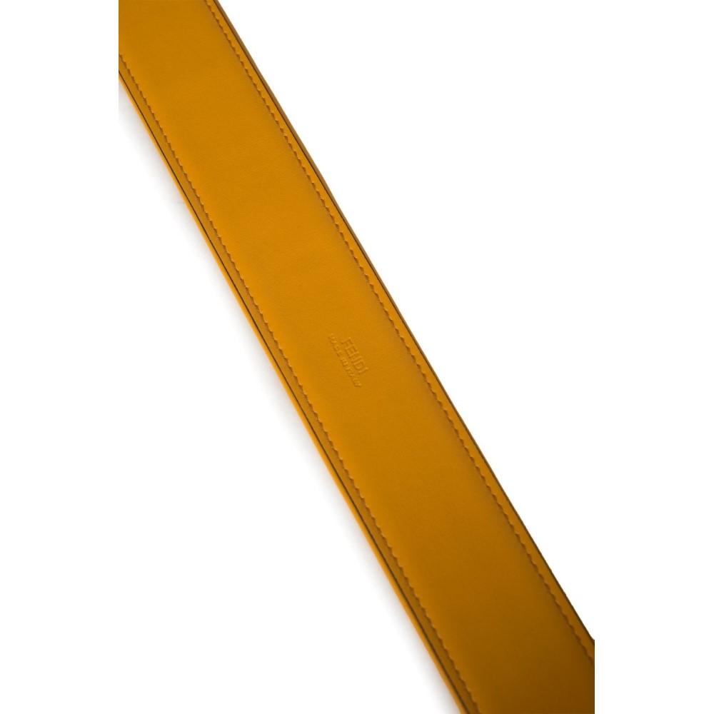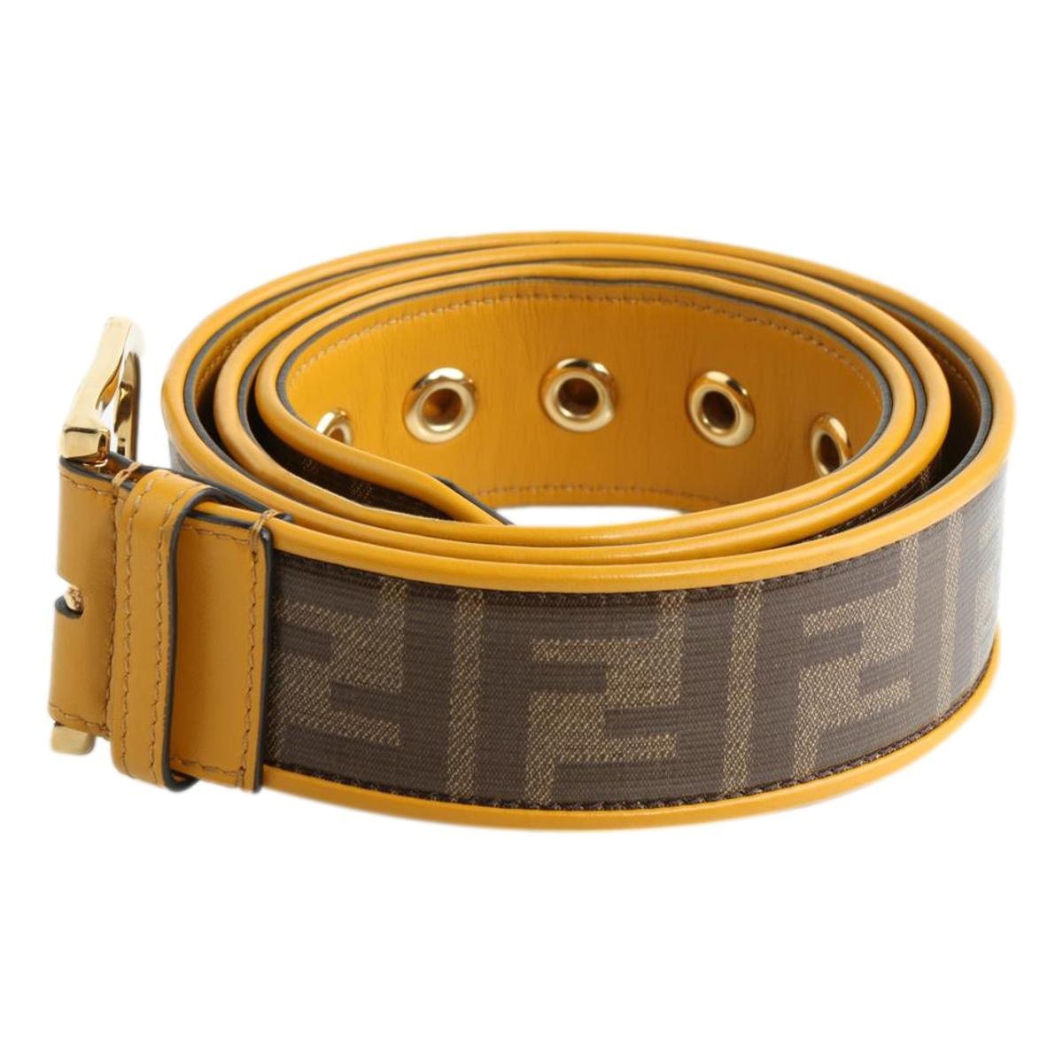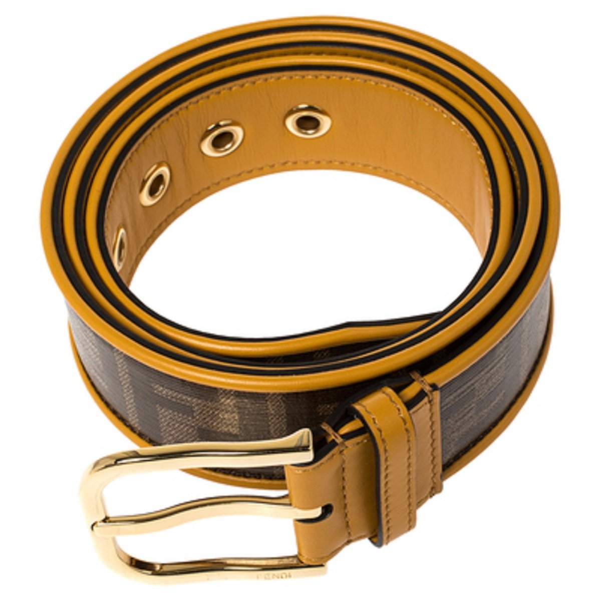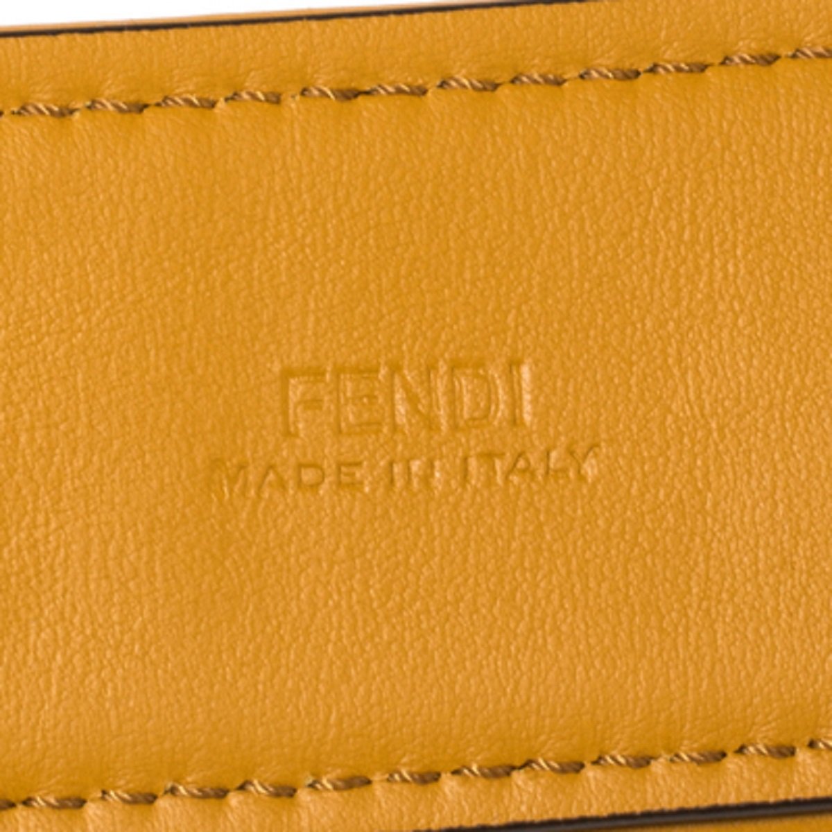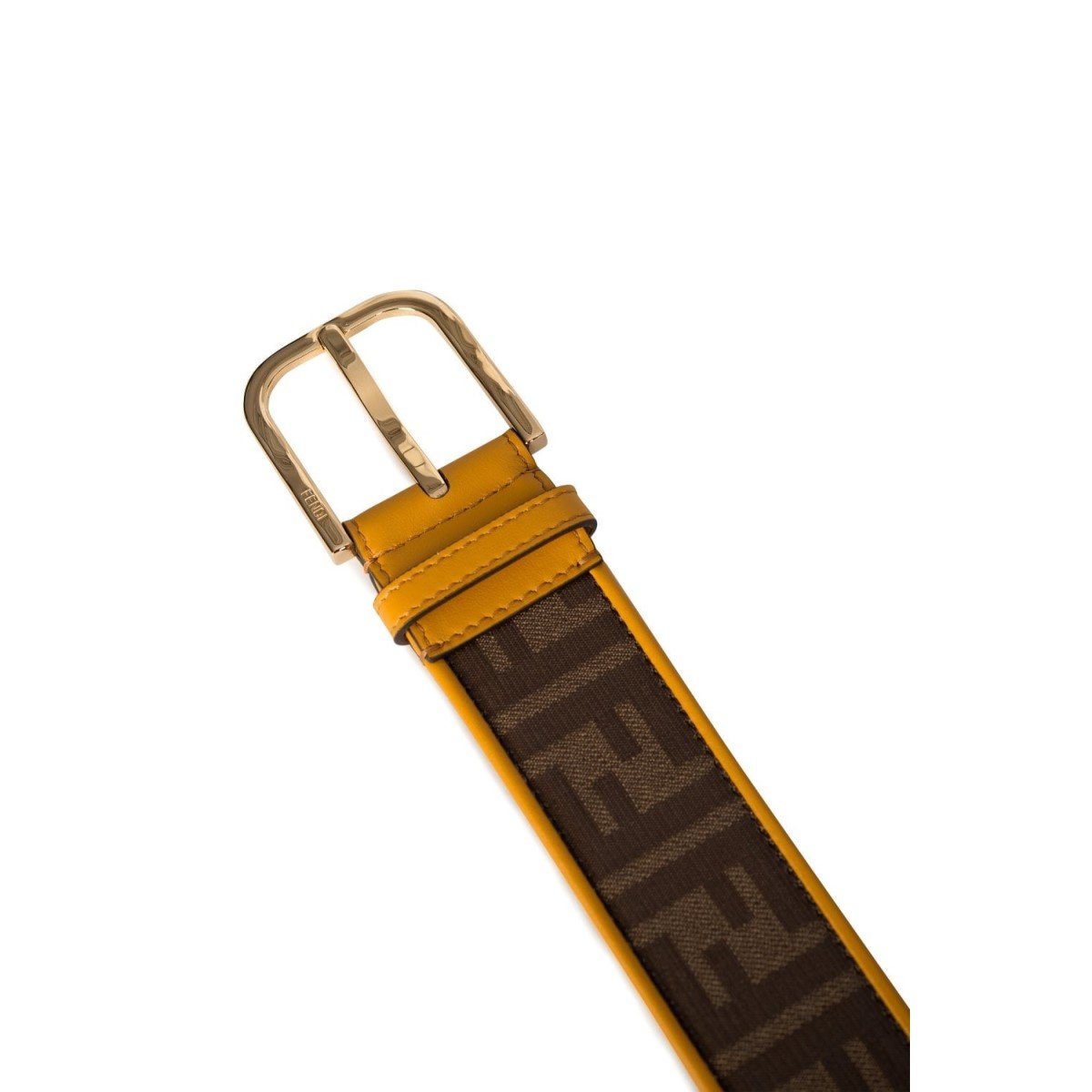 This signature FF printed belt in brown coated canvas with yellow leather trim, polished brass buckle, and contrast solid-color accents is perfect for men and women to wear dressed up or down. This belt is a instant classic and statement piece with its contrasting colors, Fendi Zucca pattern, and yellow FF Logo detail.