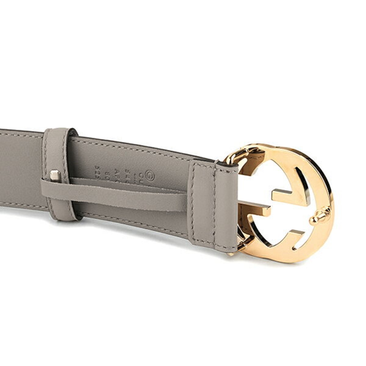 This Gucci belt is crafted of sleek Storm grey calfskin leather with an interlocking GG light fine gold-toned buckle. This classic Gucci belt is a true staple piece for your wardrobe.