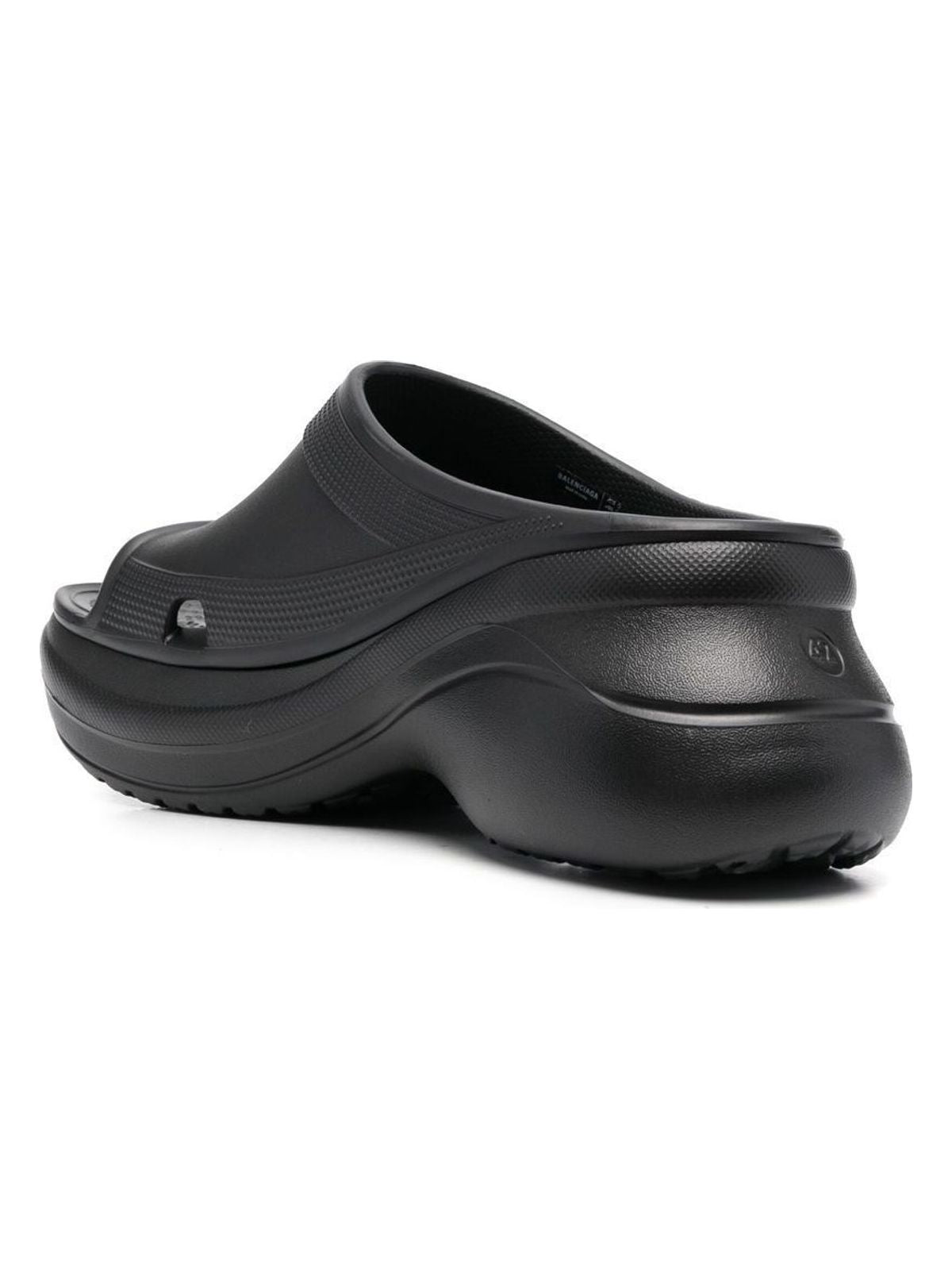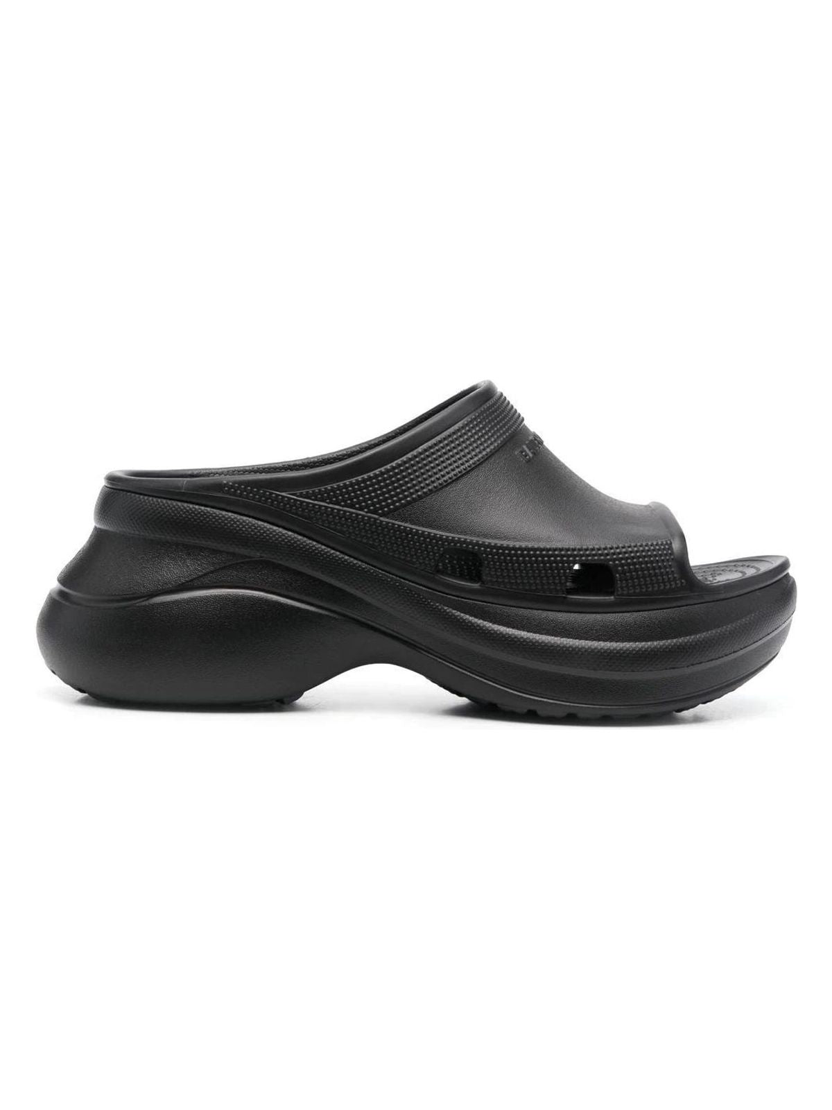 Step out in style with these low sandals made in collaboration with Crocs. Featuring a round open toe, tone-on-tone frontal lettering embossed on the upper, embossed size on the back, and a rubber sole, these black PVC sandals are the perfect combination of comfort and fashion.