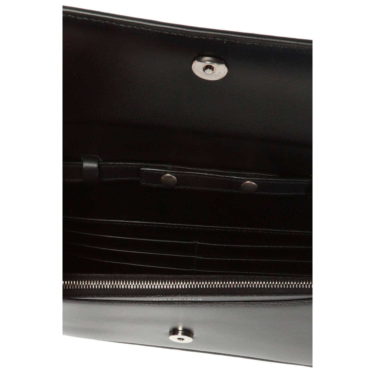 This wallet on chain is crafted with a shiny and smooth black calfskin leather. The fold-over flap top magnetic snap closure opens to a black leather lined interior with a bill slot, credit card slots, and a zipper pocket. The detachable silver-tone chain allows for this piece to be carried on the shoulder or as a clutch. This chic wallet on chain is perfect for day or a night out, with the distinctive style and quality of Balenciaga!