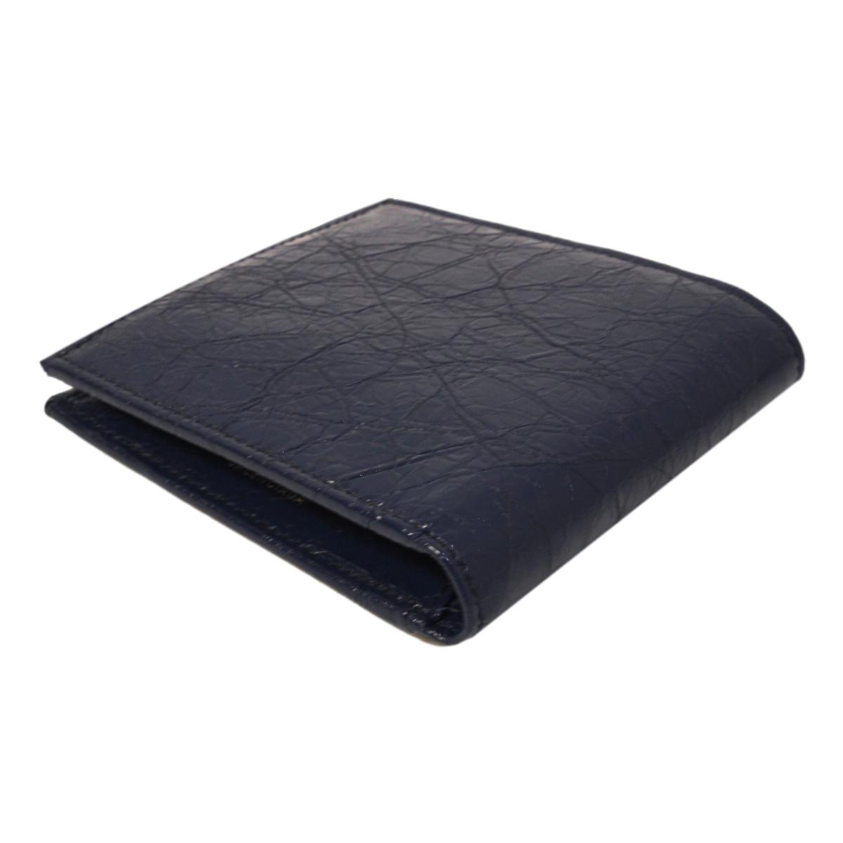This bifold wallet is crafted of a shiny crinkled blue leather with two silver-tone stud details on the front face. The interior is made with the same blue calfskin leather and features card slots, bill slots, and a coin compartment. The clean design and functionality of this wallet make it perfect for everyday use!