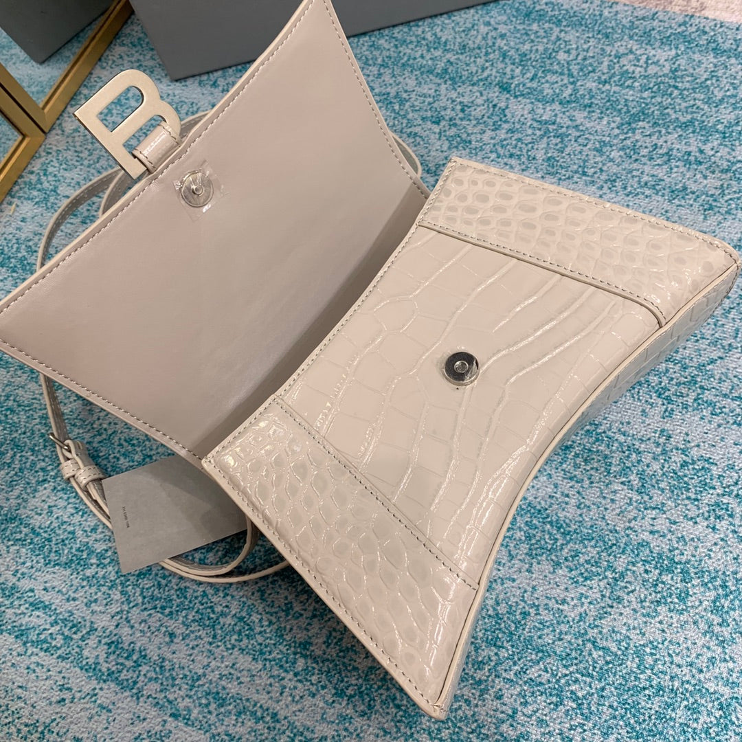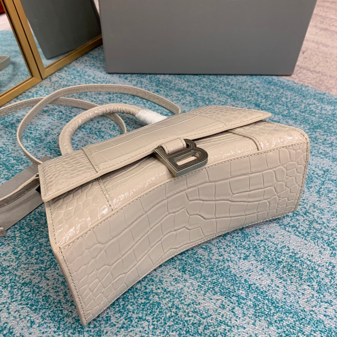 Hourglass Small Top Handle Bag in white shiny crocodile embossed calfskin, aged gold hardware