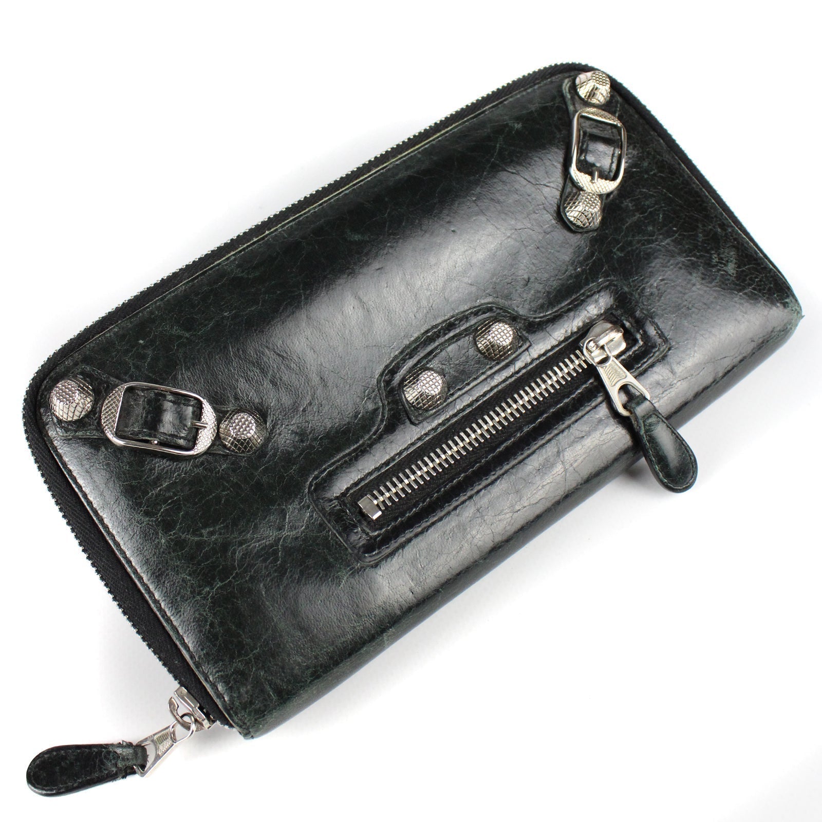 Black color Balenciaga Paris signature embossed inside Very flexible leather Dimensions: 21cm x 12cm Zipped opening 12 card compartments A zipped pocket Ticket compartments Dark green reflections Some signs of wear in the corners, patinated leather