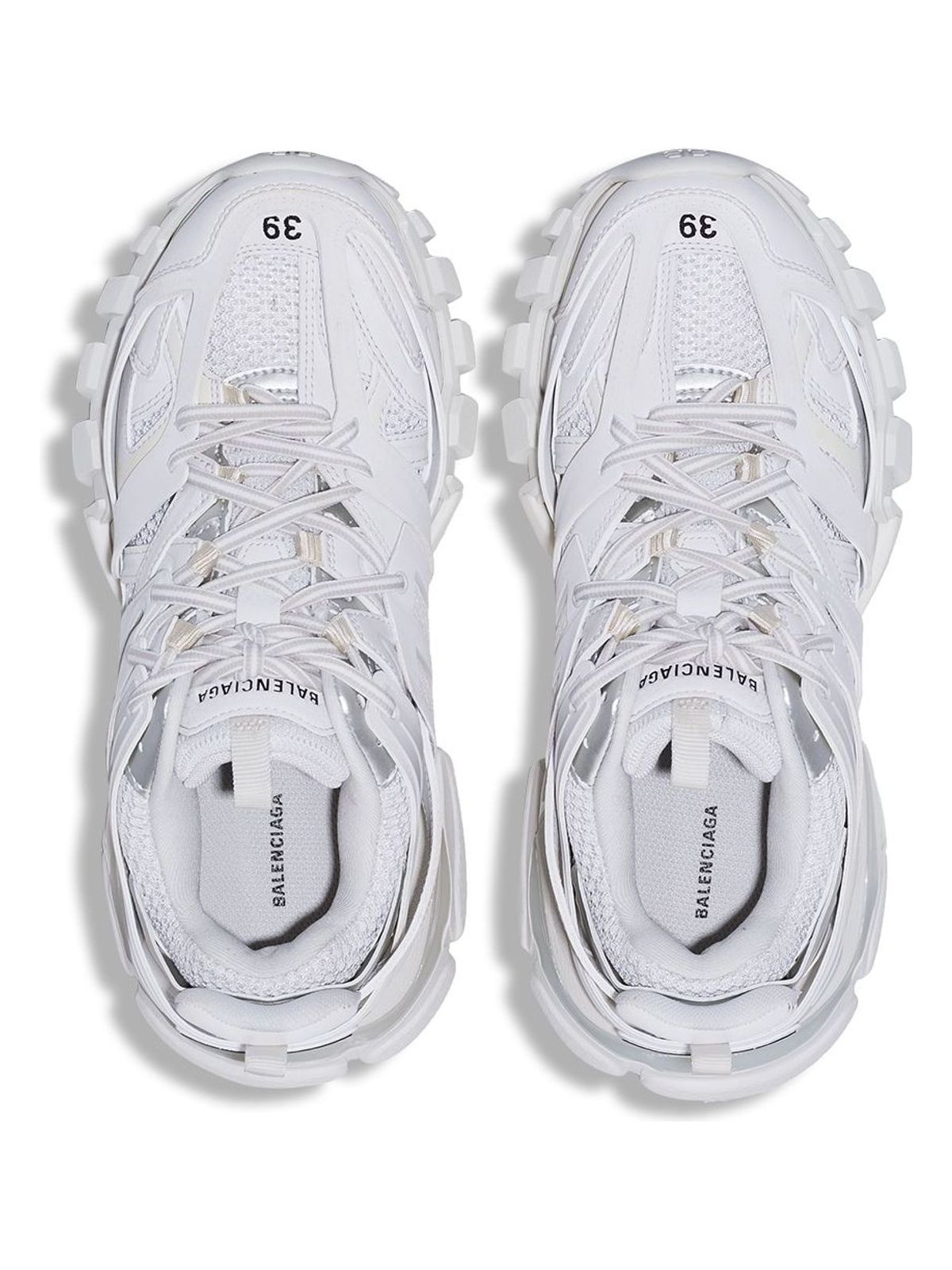 Step up your sneaker game with these white round toe front lace-up fastening track sneakers. Featuring a logo-print tongue, logo print to the side, and a logo pull-tab at the heel, these sneakers are both stylish and sustainable. The chunky rubber sole provides comfort and support for all-day wear.