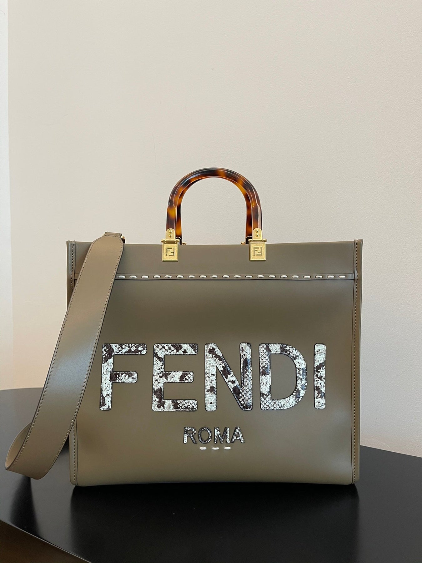 Medium Sunshine Shopper bag made of gray leather with FENDI ROMA lettering in python-printed elaphe and stiff tortoiseshell-effect plexiglass handles.