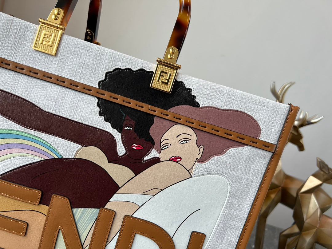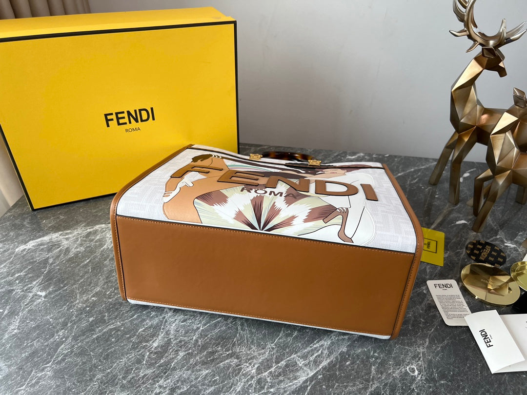 Medium Sunshine Shopper bag in white glazed fabric with tone on tone printed FF motif and beige, brown and gold leather inlaid by hand. Embellished with embossed FENDI lettering. Tortoiseshell-effect plexiglass rigid handles