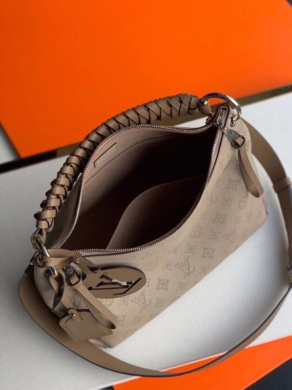 The Beaubourg Hobo MM bag is made from Mahina calf leather perforated with the Monogram pattern. It boasts a stylishly braided-leather top handle, with hand-painted edge-dyeing along the braids. The leather zip pulls and large LV charm sign the bag. A detachable, wide leather strap means that this supple bag feels comfortable against the body.
