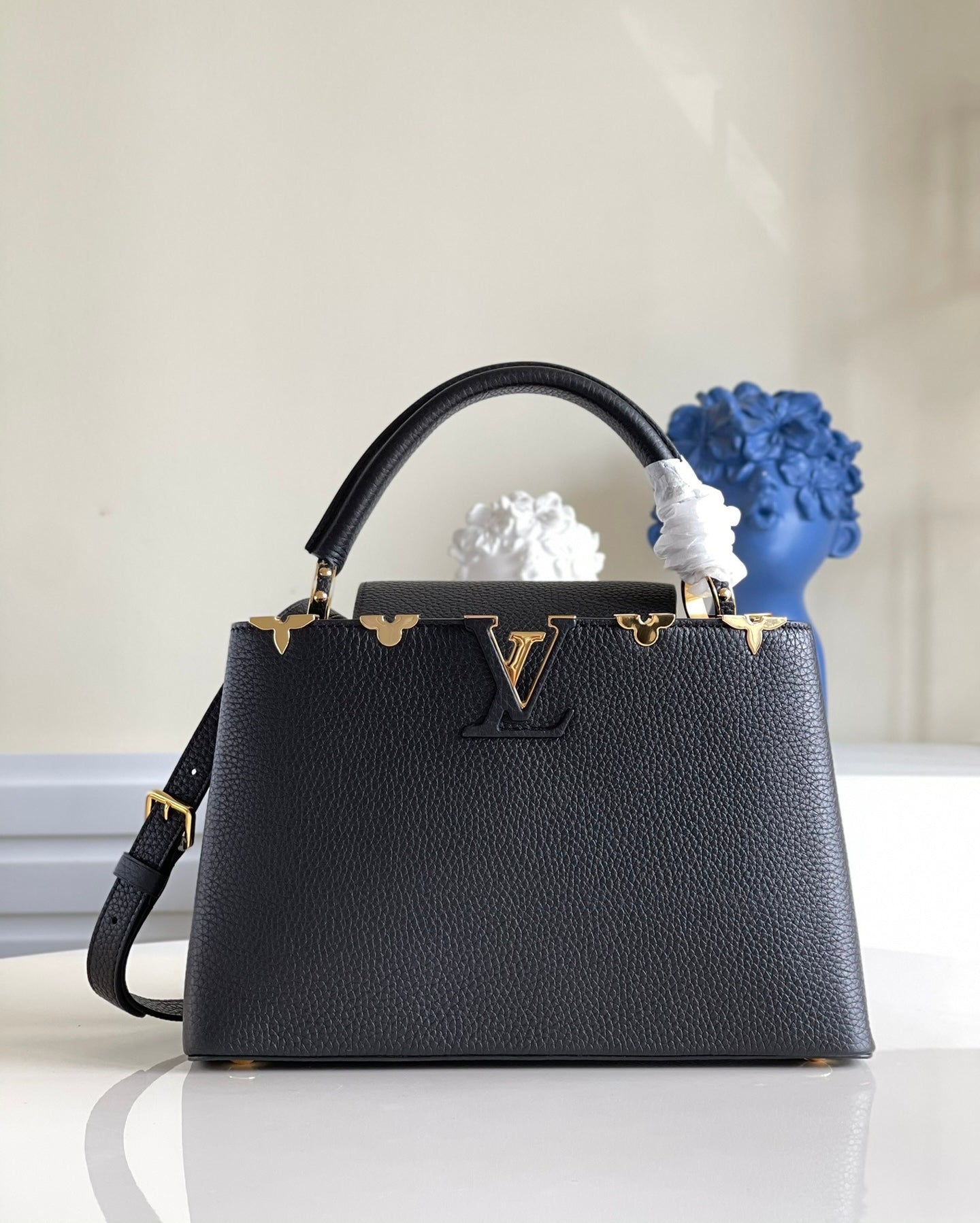This season the House tells a new Capucines story. Embellished with a delicate frieze of metallic Monogram flowers, the emblematic bag is more feminine than ever. The MM model, in refined Noir with a crown of gold-toned blooms, is both elegant and practical.