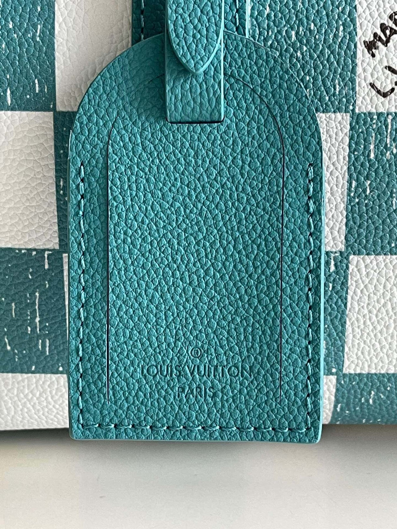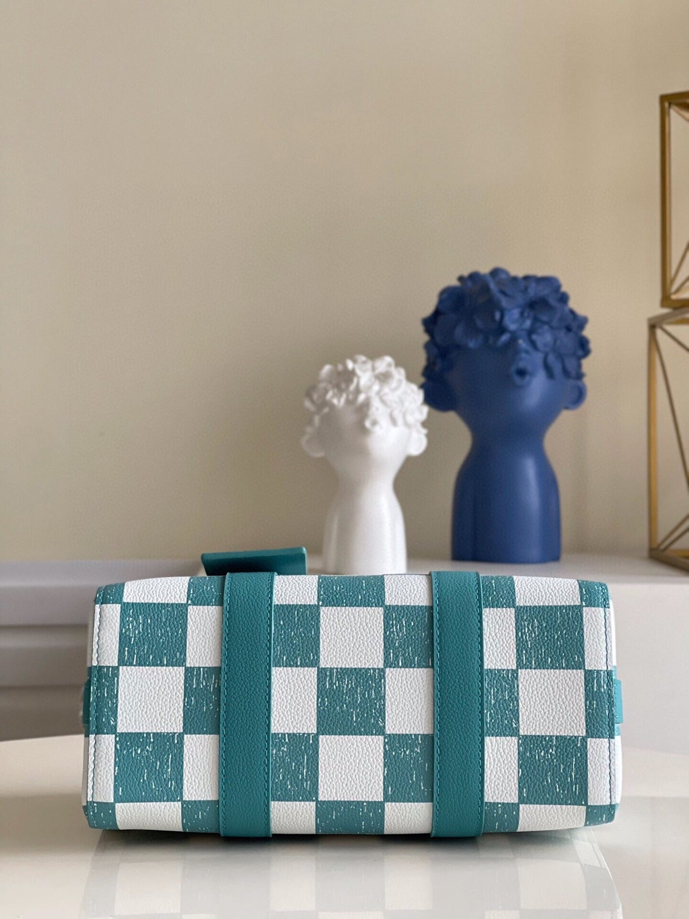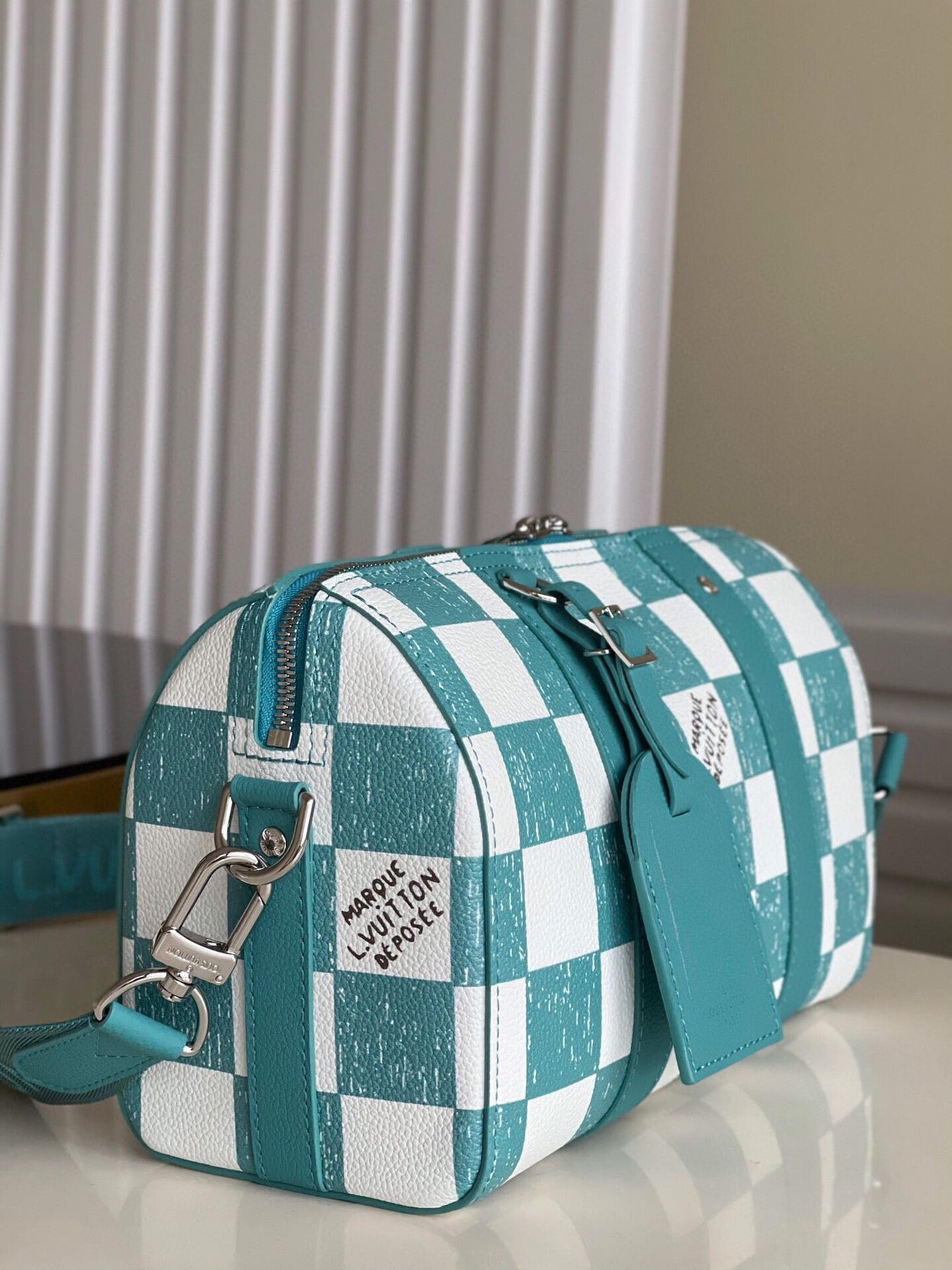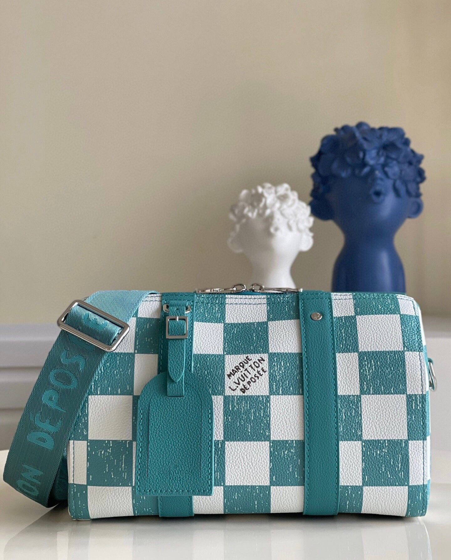 A miniature version of the House’s iconic Keepall Bandoulière bag, the City Keepall is a stylishly small men’s bag to be worn on the shoulder with its adjustable leather strap. Made from leather with a black-and-gray Damier pattern, it features a leather nametag and two leather bands on the side.