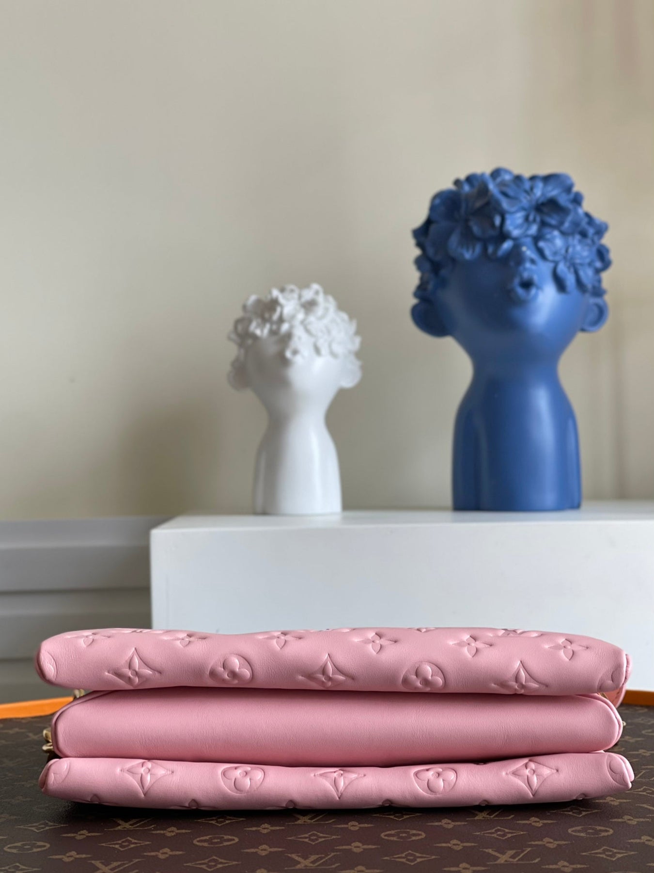 Fashioned from puffy lambskin and accessorized with a chunky gold-color chain, this Coussin PM handbag is part of the Fall-Winter 2020-21 Collection. Its bright vibrant colorway is Nicolas Ghesquière’s translation of the joy and audacity of women. The Coussin can be worn cross-body with the strap, as a chain baguette, or carried under the arm.