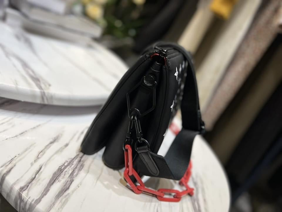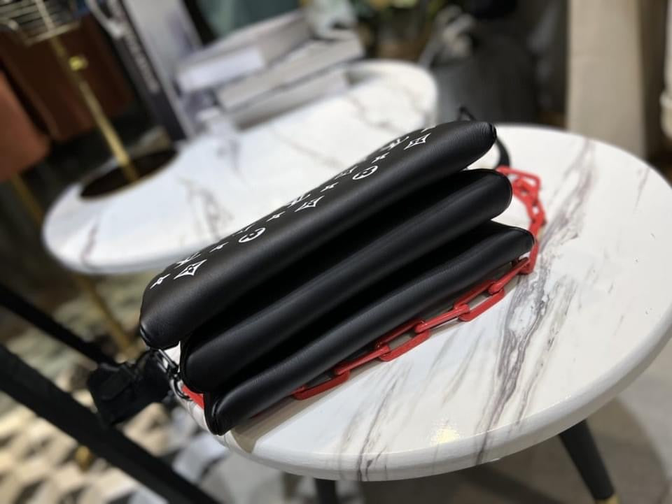 The bold black-and-white Monogram print on the embossed puffy lambskin of this Coussin PM handbag is perfectly complemented by the matte-black hardware and bright-red resin chain. The chain enables shoulder carry while a wide textile strap allows shoulder and cross-body wear. Voluminous and soft, like a cushion, the Coussin is very body-friendly.