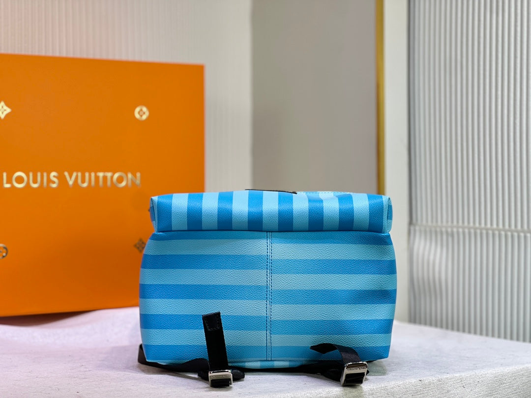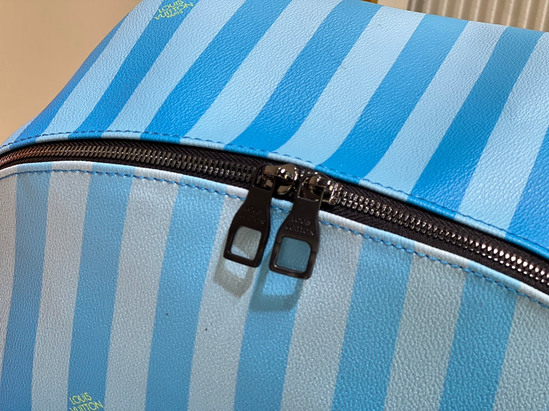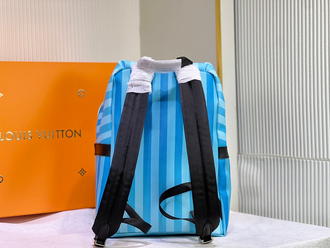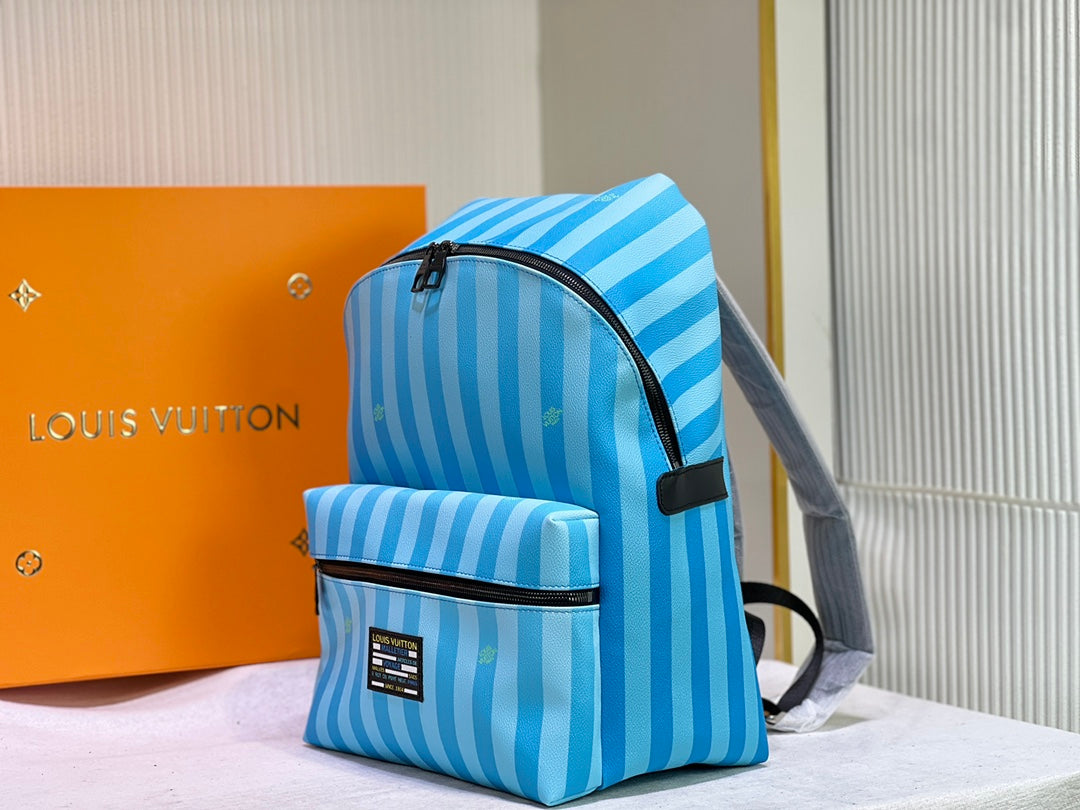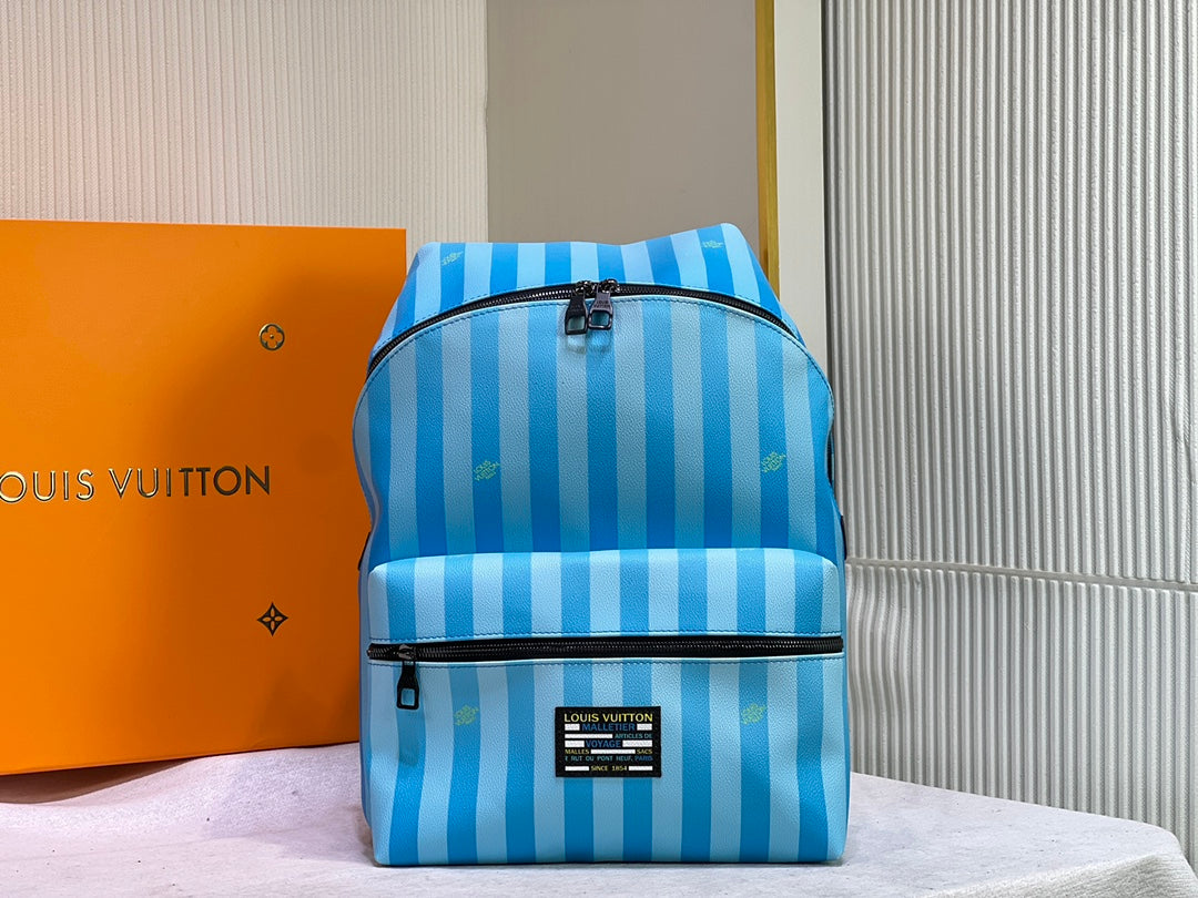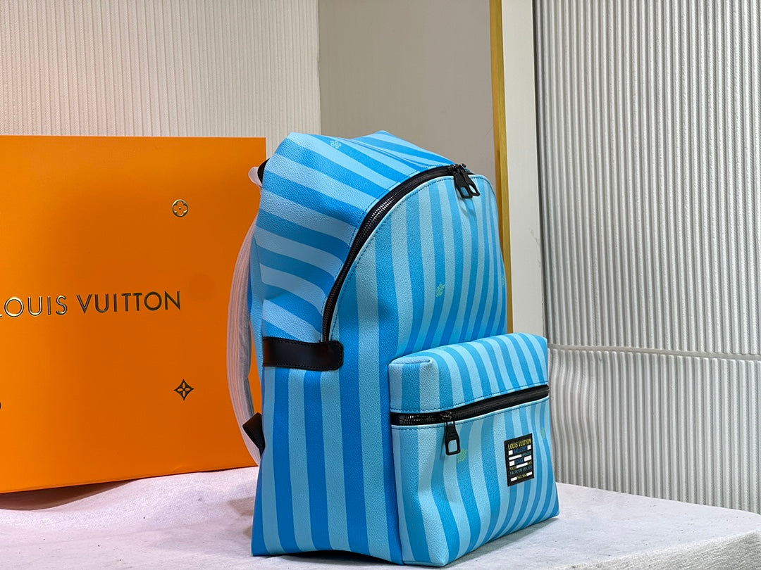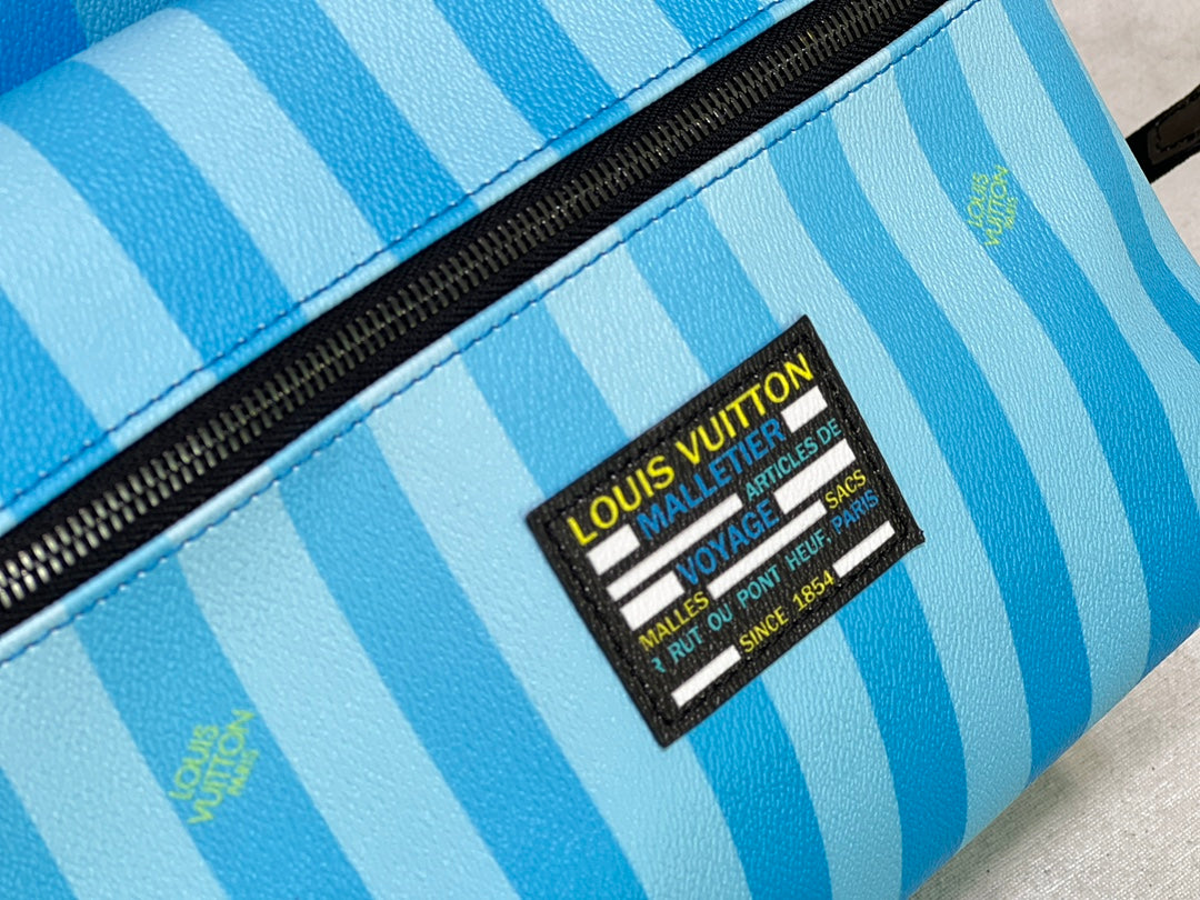The Discovery Backpack looks fresh in the gradient blues of Damier Stripes canvas, a reimagining of the stripes found on vintage Louis Vuitton trunks. The fading stripes, together with the new leather patch, inspired by the signage on the sides of Louis Vuitton historic trucks, bring a contemporary feel to this backpack’s boxy shape.