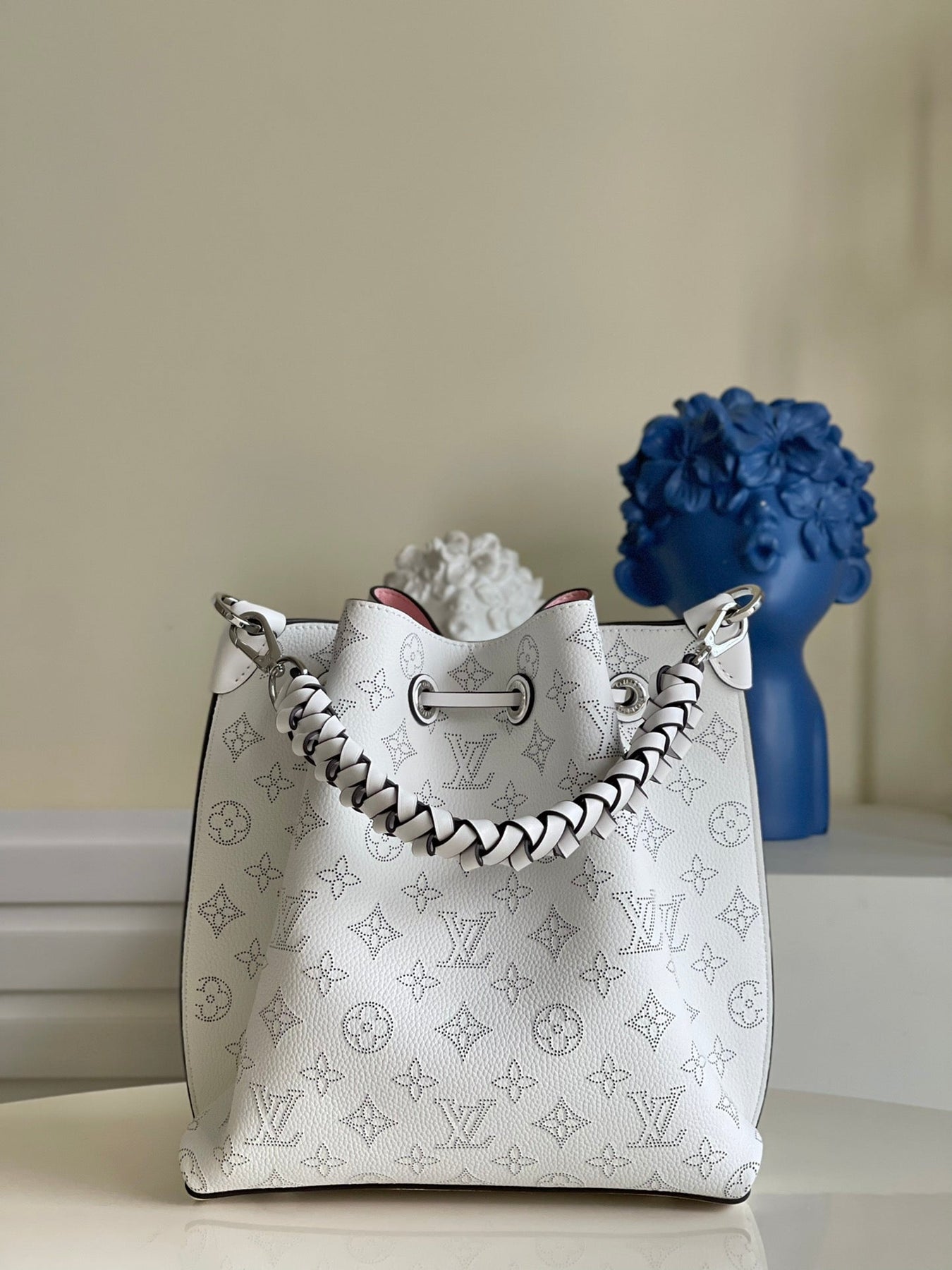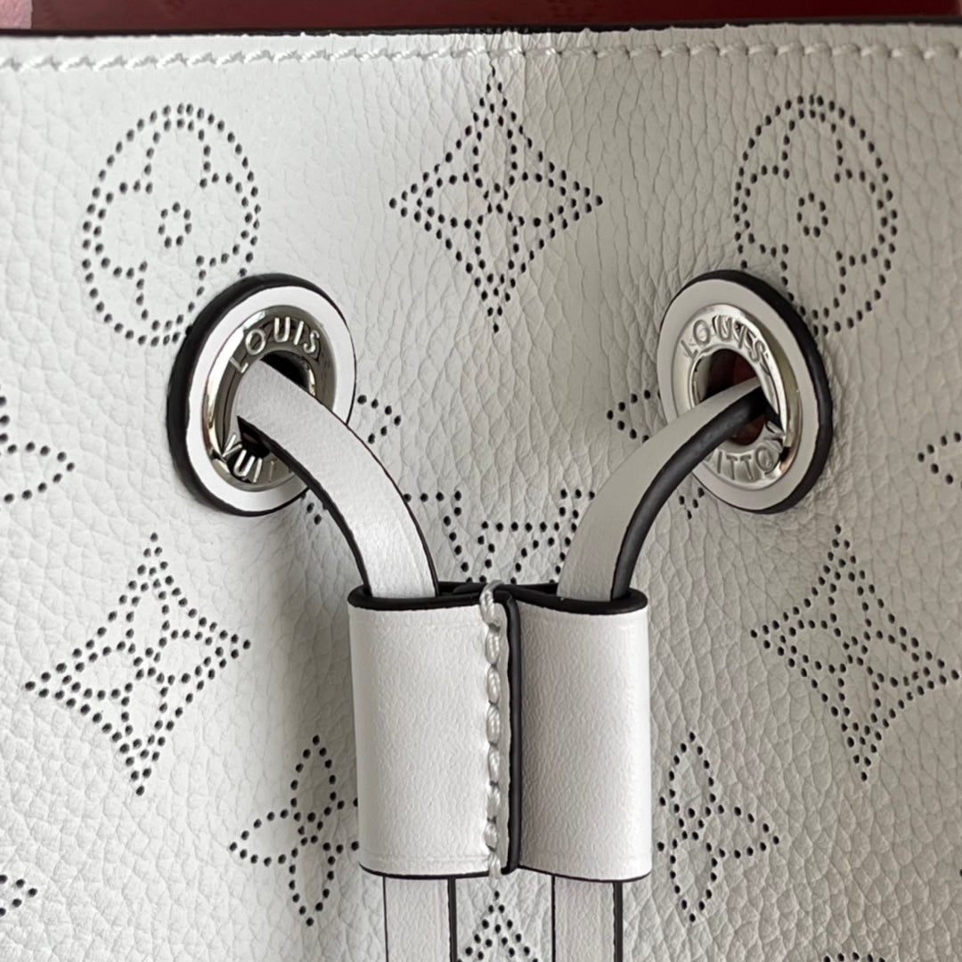 The Muria bucket bag is made from Mahina calf, a perforated leather with a discreet Monogram motif. Supple and sophisticated, it is a pleasure to carry, either by the braided top handle or the long leather strap, which adjusts for short- and long-shoulder or hands-free cross-body wear. Crafted signature details include a name tag and keybell in smooth calfskin.