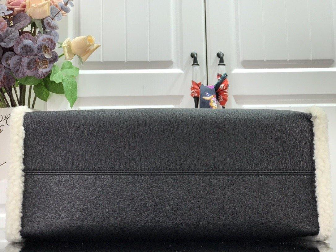 The OnTheGo GM tote is fashioned from grained black leather with shearling inserts that create Monogram Flowers and LV Initials. With its large capacity, shoulder straps, and top handles, this functional tote is a great everyday bag. The pink, cream, blue, and caramel tones of the shearling Monogram motif look great on the dark grained leather.