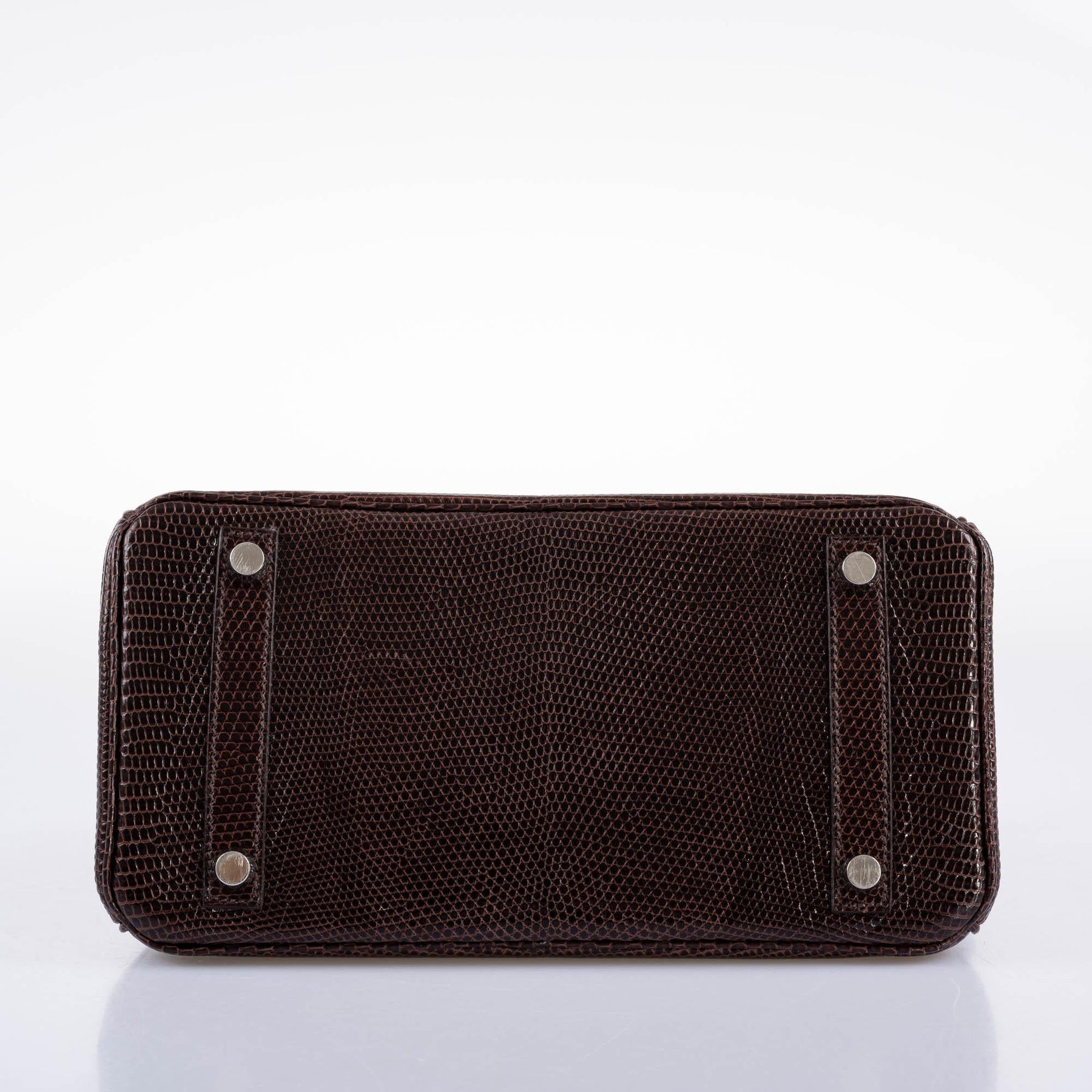 Lizard Birkins have always been a rarity, their small scales resembling tiny jewels encrusting the bag. Neutral Lizard Birkins are even rarer still, and provide this luxurious exotic skin with a muted foray into regular use. This example, in rich dark Havane brown paired with Palladium hardware, has been maintained in excellent condition, and is dark enough of a color to run little risk of discoloration when used. Lizard Birkins in such practical colors as this rarely come to market, as they are often among owners favorite bags. The single " - " mark beside the brand stamp indicates this as a Nilo Lizard Birkin. Nilo Lizard is distinct for its longer, more oval shaped scales that have a bit more texture than those on Salvator Lizard.