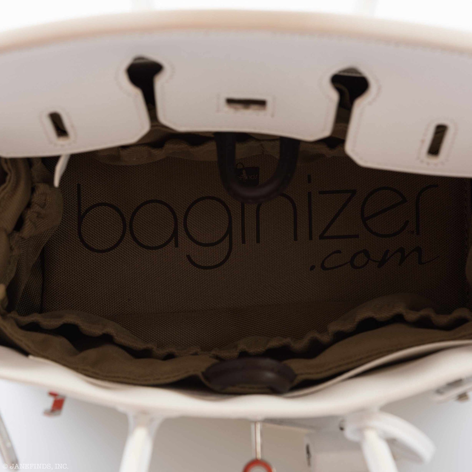 Hermes white 25cm Birkin in Epsom leather, is there anything more perfect! The interior is lined in white Chevre with one zip pocket with an Hermes engraved zipper pull and an open pocket on the opposite side. Comes with Hermes box, Hermes dustbag, clochette, lock, two keys, clochette, raincoat, care booklet, felt.