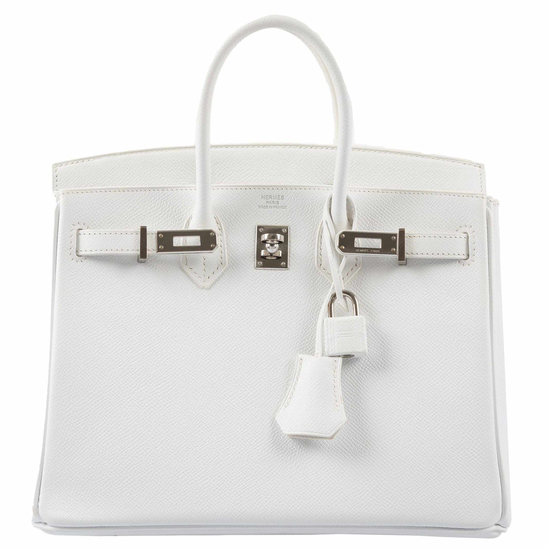 Hermes white 25cm Birkin in Epsom leather, is there anything more perfect! The interior is lined in white Chevre with one zip pocket with an Hermes engraved zipper pull and an open pocket on the opposite side. Comes with Hermes box, Hermes dustbag, clochette, lock, two keys, clochette, raincoat, care booklet, felt.