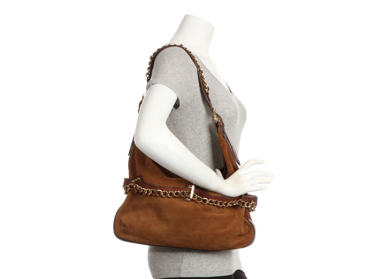 If Burberry's Brown Suede Chain Hobo were a chocolate sundae, shining gold hardware would be the cherry on top! Made of slouchy brown suede with thick brown leather detailing, it has gold curb chain running along the adjustable leather shoulder strap shown with a drop of 12 inches and through gold loops on the front. Unzip the top and you'll find brown fabric lining with one zipped and two slide pockets inside. In very good condition with a card, it has scratches on the leather parts and hardware, as well as faint wear on the corners. The suede is delicious in its own right—the gold chain takes it to the next level!