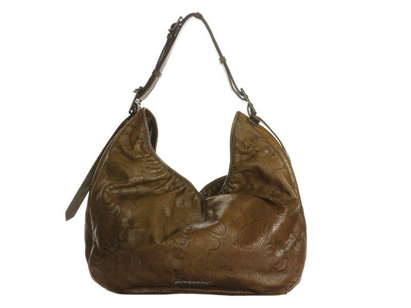 Burberry's Brown Perforated Flowers Hobo is leather – I had to check quite a few times! Gathered at the top, the pewter zipper opens to a black logo lining with three slide pockets and a zipped pocket inside. With wear on the bottom, corners, and edges, there are a few marks on the leather, as well as a bit of wear inside. Although it looks as if the long strapping at the ends may have something to do with the strap, they are only for decoration. The adjustable strap is shown here with a drop of eleven and a half inches. With metal letters on the back and all those perforated flowers on this large bag, this is one bouquet you are not going to want to miss!