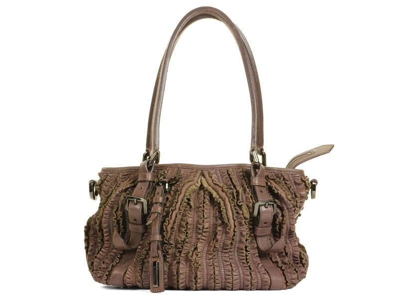 It's not every day you see leather ribbons ruffled up on a bag, so Burberry's Violet Prorsum Ruffle Satchel is a delightful surprise! With wear on the bottom, hardware, handles, and glazing, as well as the beginnings of fading of the leather, you can see the love. Open the gunmetal zipper to the black fabric lining with two slide pockets and a zipped pocket inside. The handles are adjustable and shown here with a drop of eight and a quarter inches with a luggage tag hanging nearby. This is a bag to fall in love with!